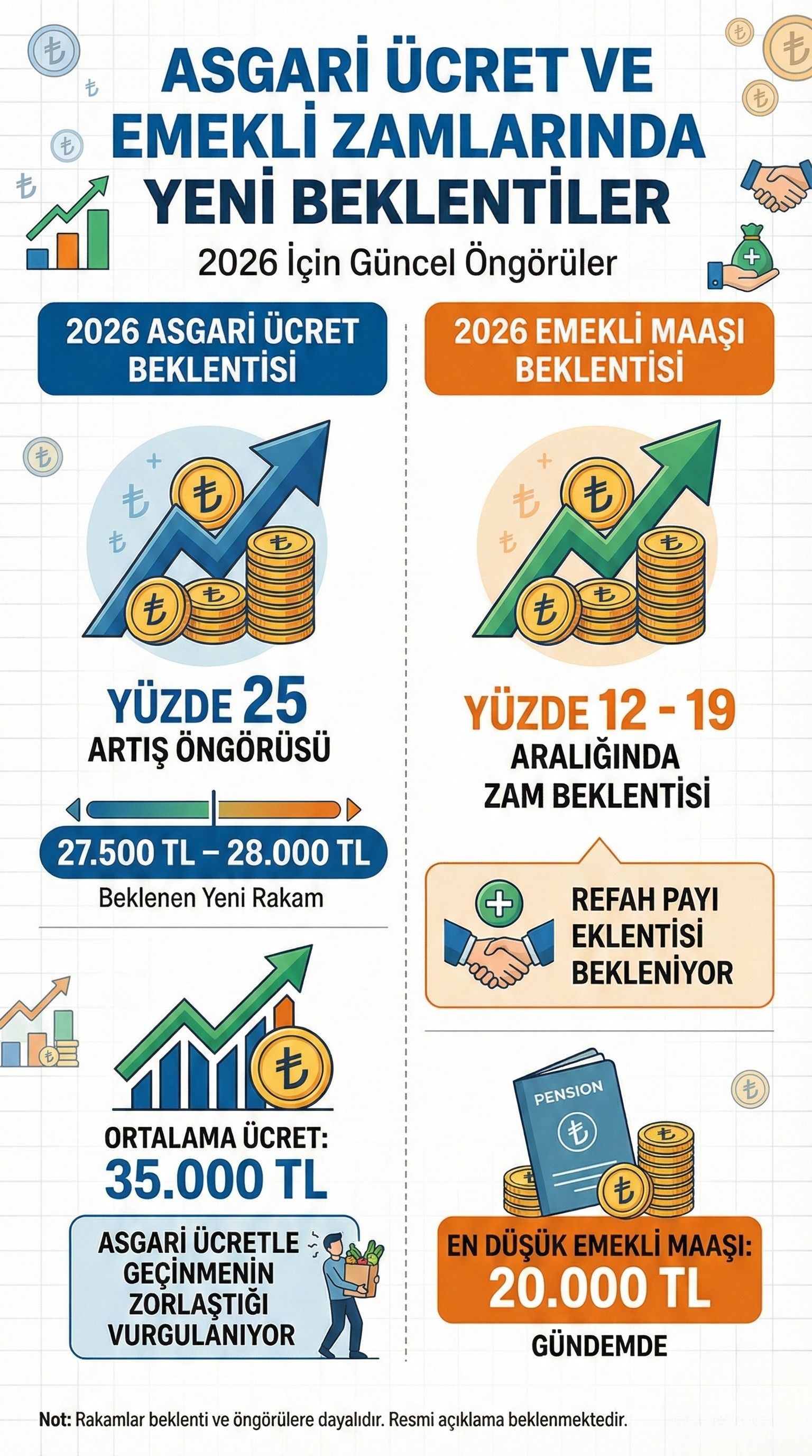 SGK Uzmanı Özgür Erdursun, 2026 yılı asgari ücret ve emekli zamlarına ilişkin değerlendirmelerde bulundu. Erdursun, mevcut tabloya göre yüzde 25’lik artışın “güçlü senaryo” haline geldiğini ve asgari ücretin 27 bin 500 ile 28 bin lira bandında açıklanabileceğini söyledi.