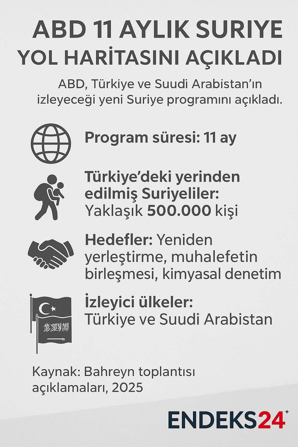 ABD Suriye Özel Temsilcisi ve Türkiye Büyükelçisi Thomas Barrack, Bahreyn’de düzenlenen toplantıda Suriye hükümetine önerilen 11 aylık bir programı açıkladı. ABD Başkanı tarafından onaylanan program kapsamında Türkiye ve Suudi Arabistan sürecin takipçisi olacak. Barrack, planın hem yerinden edilmiş Suriyelilerin durumu hem de bölgesel istikrar için önem taşıdığını belirtti.