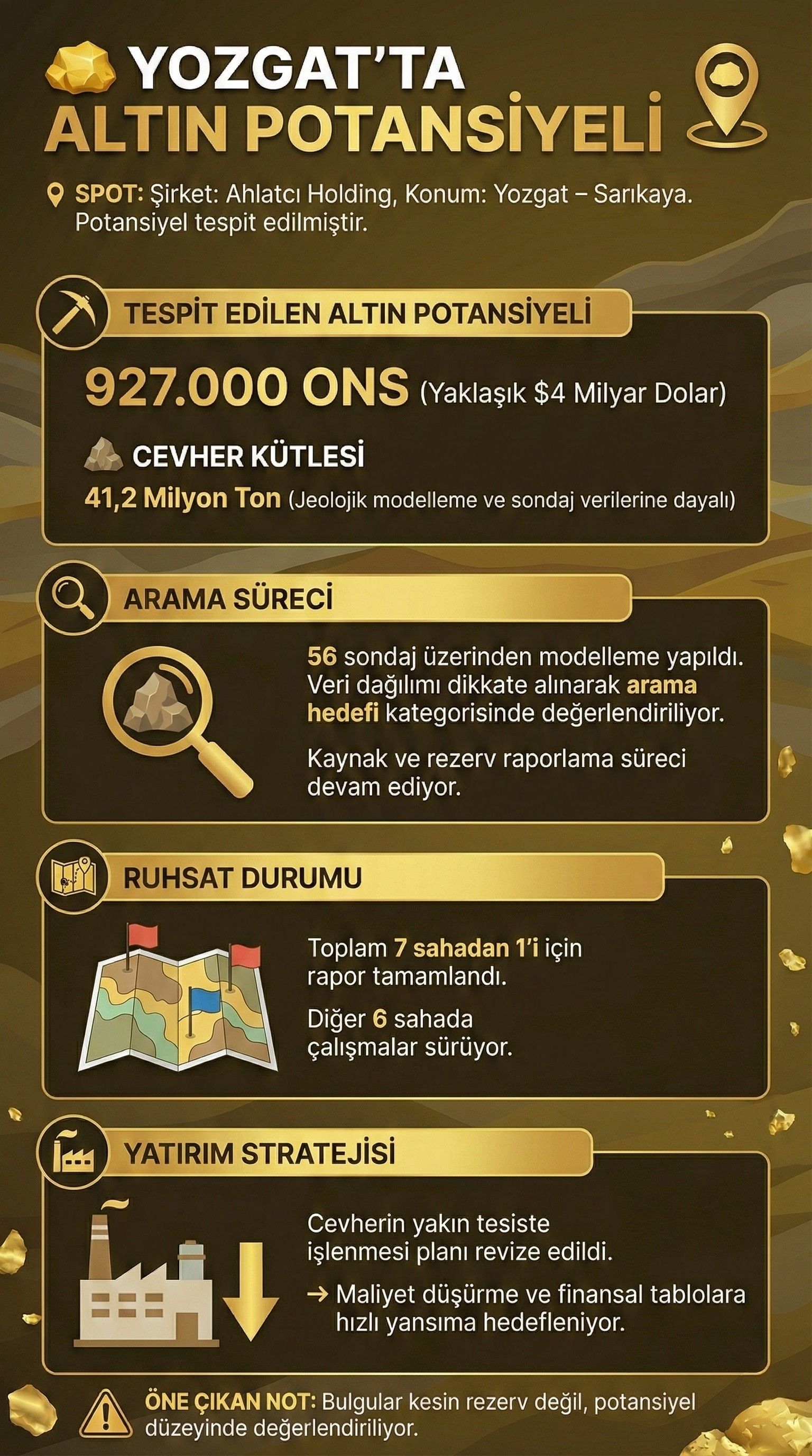 Ahlatcı Holding, Yozgat’ın Sarıkaya ilçesinde yürütülen sondaj çalışmalarında yaklaşık 927 bin ons büyüklüğünde ve bugünkü fiyatlarla 4 milyar dolar seviyesinde altın potansiyeli tespit edildiğini KAP’a bildirdi. Açıklamada, bulgunun arama hedefi düzeyinde olduğu ve çalışmaların sürdüğü belirtildi.