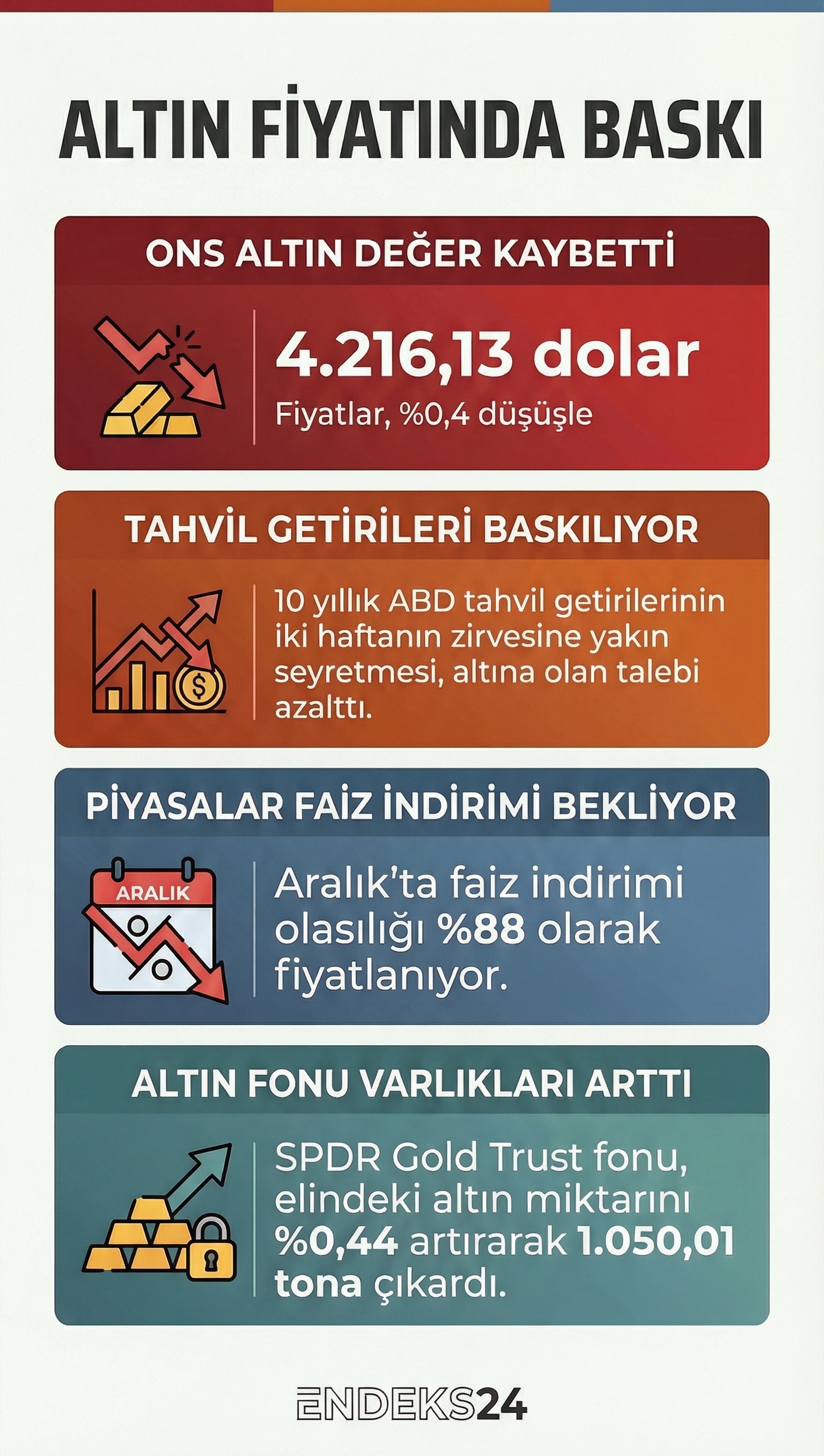 Pazartesi günü 21 Ekim’den beri en yüksek seviyeyi test eden ons altın, yüzde 0,4 düşüşle 4.216,13 dolar seviyesine indi. ABD’de Aralık vadeli altın kontratları da yüzde 0,7 düşüşle 4.246,60 dolar düzeyinde işlem gördü.