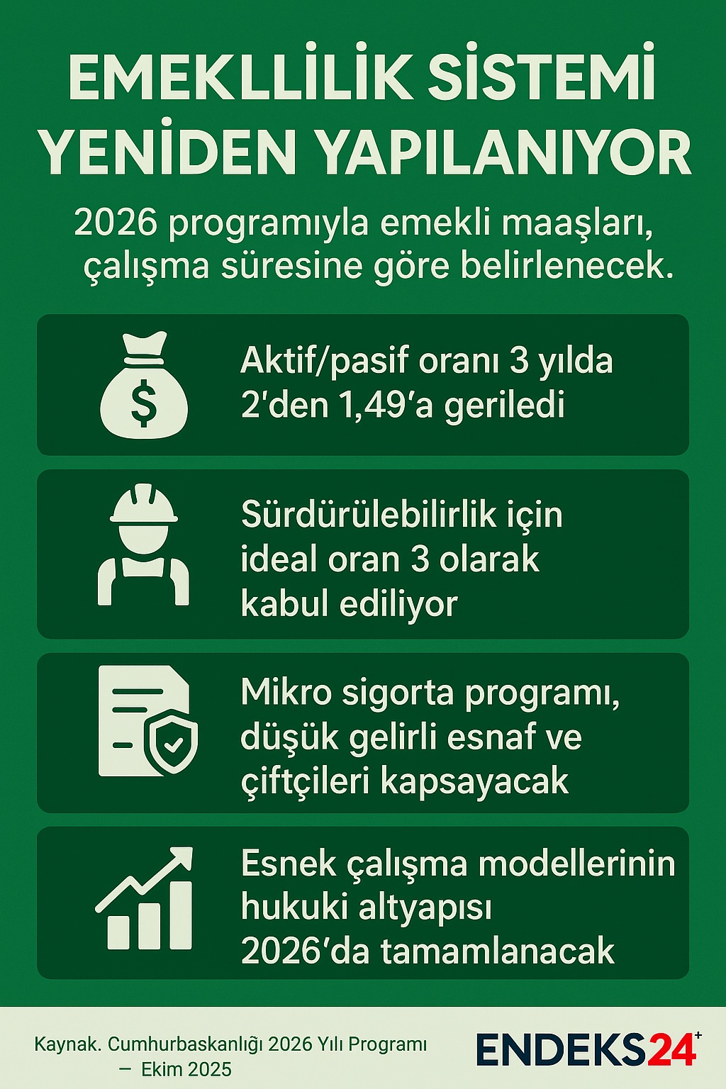 Yeni emeklilik sistemiyle çalışanların daha uzun süre istihdamda kalması teşvik edilecek. Bu sayede hem erken emeklilik oranlarının azaltılması hem de sosyal güvenlik sisteminde aktif-pasif dengesinin yeniden kurulması hedefleniyor. Programda ayrıca esnek ve hibrit çalışma modellerinin sosyal güvenlik sistemiyle uyumlu hale getirileceği belirtiliyor.