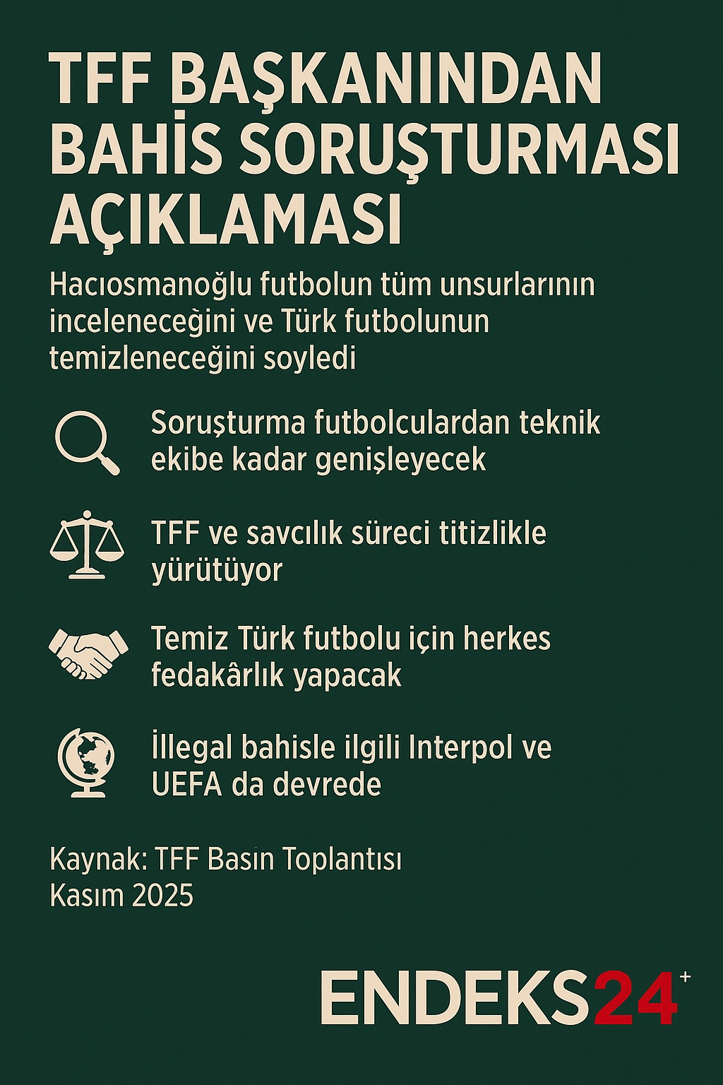 TFF Başkanı İbrahim Hacıosmanoğlu, hakemlerden futbolculara uzanan bahis soruşturmasının yeni aşamasına ilişkin değerlendirmelerini basın toplantısıyla duyurdu. Sürecin yalnızca oyuncularla sınırlı kalmayacağını, teknik direktörden malzemeciye kadar tüm birimlerin kapsam dahiline alındığını söyledi.