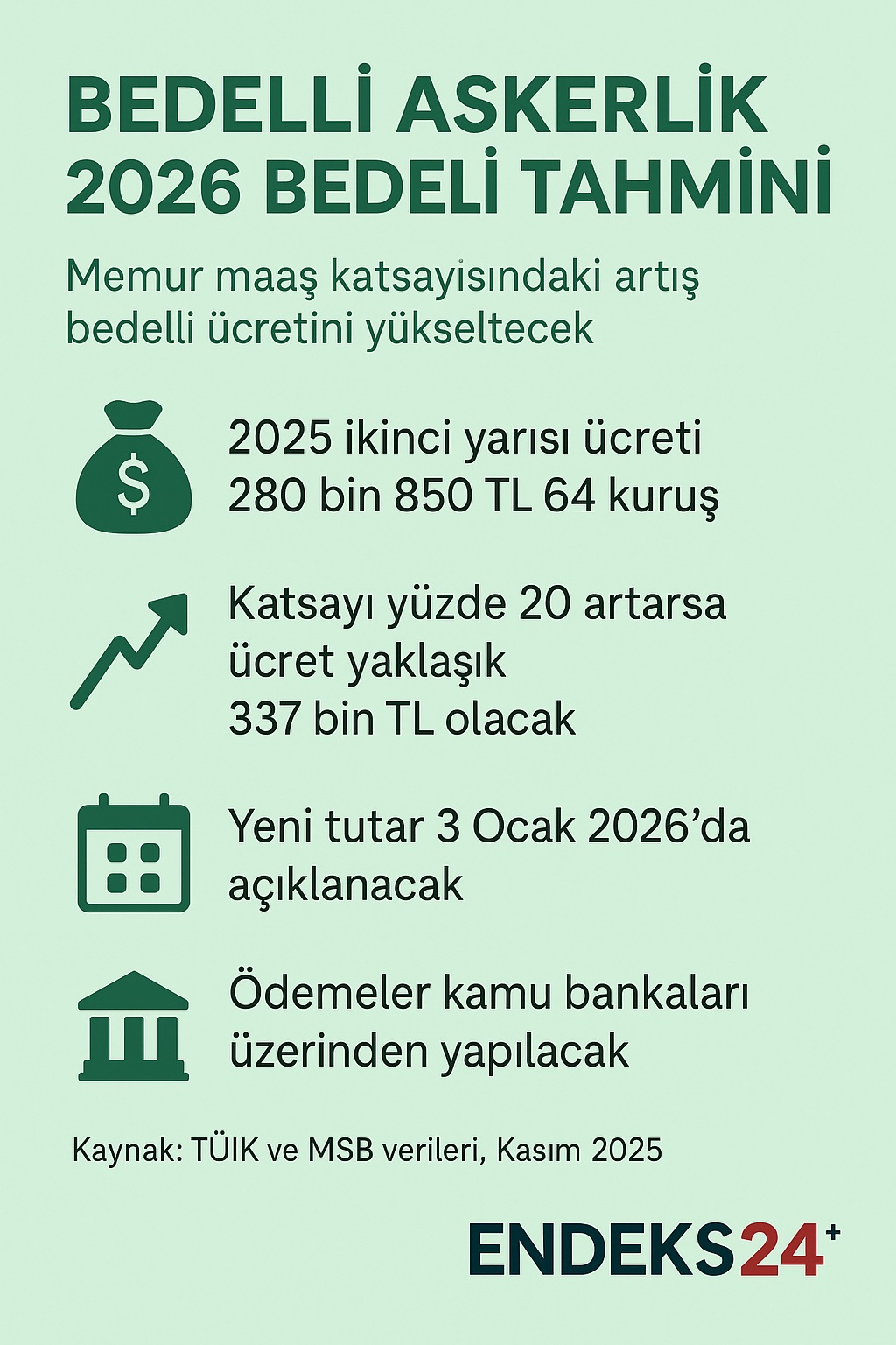 Milli Savunma Bakanlığı, 2026 yılının ilk haftasında yeni katsayının yürürlüğe girmesiyle birlikte bedelli askerlik ücretini kamuoyuna duyuracak. Yeni tutar, ocak ayında yürürlüğe girecek memur maaş katsayısına göre uygulanacak ve yılın ilk yarısında geçerli olacak.