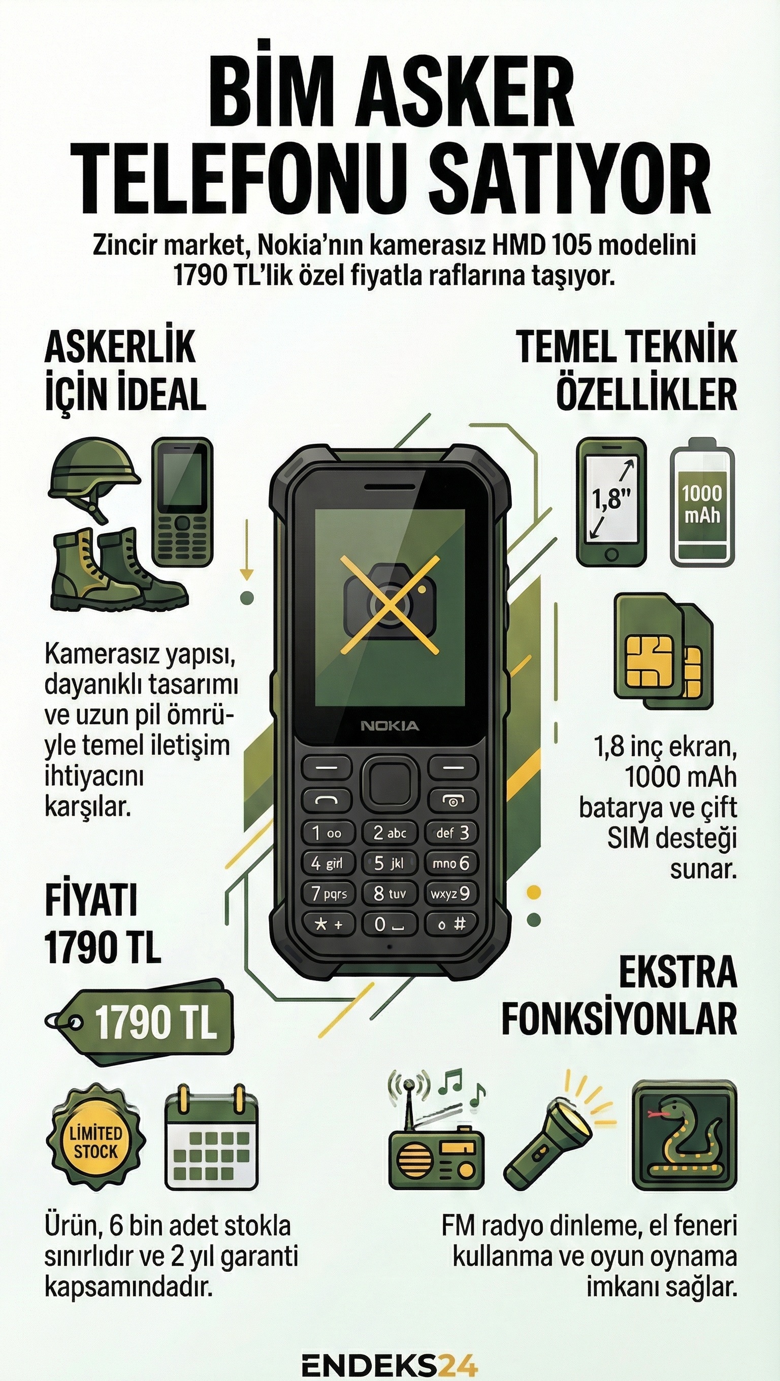 BİM, bu hafta özellikle askere gidecek kullanıcıların ilgisini çekecek uygun fiyatlı bir tuşlu telefonu raflara taşıyor. Zincir market, Nokia’nın HMD 105 2023 LEDA modelini 5 Aralık 2025 itibarıyla mağazalarında satışa çıkaracak.