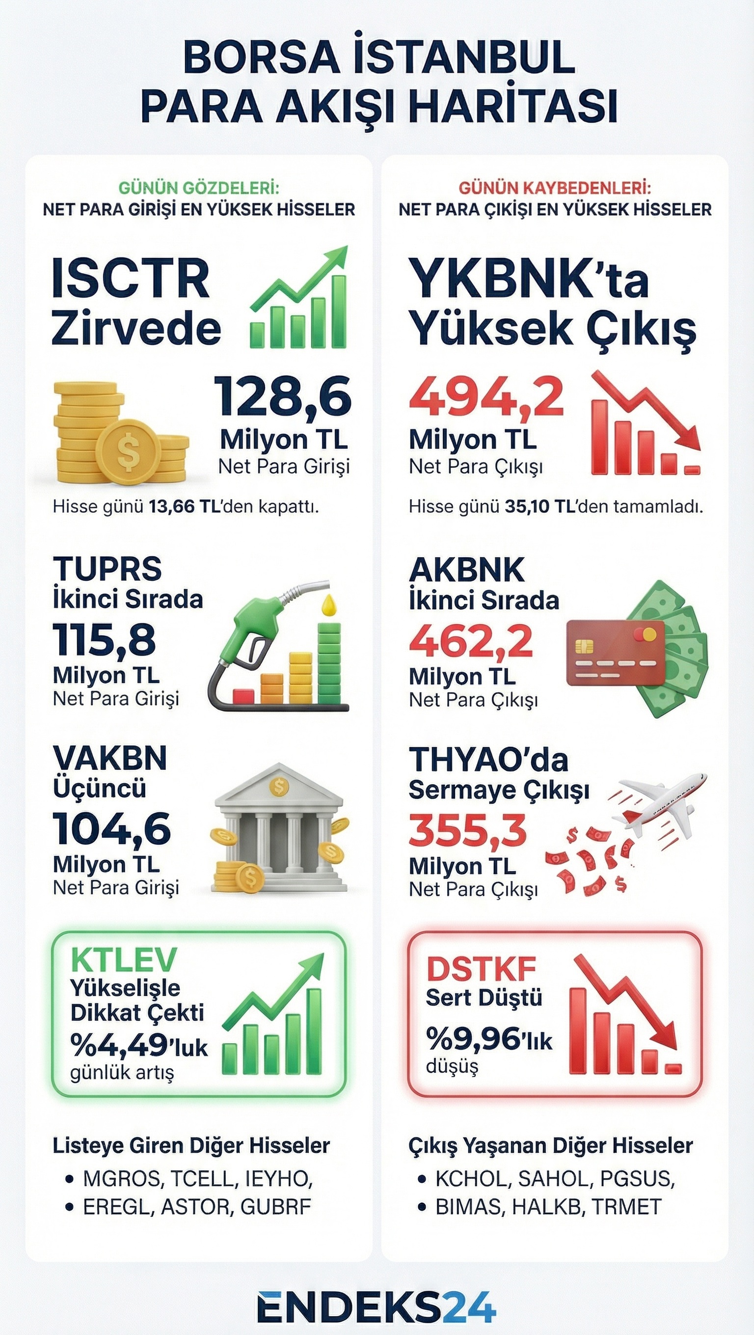 Günlük bazda en yüksek net para girişi ISCTR’de gerçekleşti. Hisse, 128 milyon 644 bin lira tutarında giriş ile günü 13,66 TL seviyesinde tamamladı. TUPRS 115 milyon 821 bin lira ile ikinci sırada yer alırken, VAKBN 104 milyon 607 bin liralık giriş kaydetti.