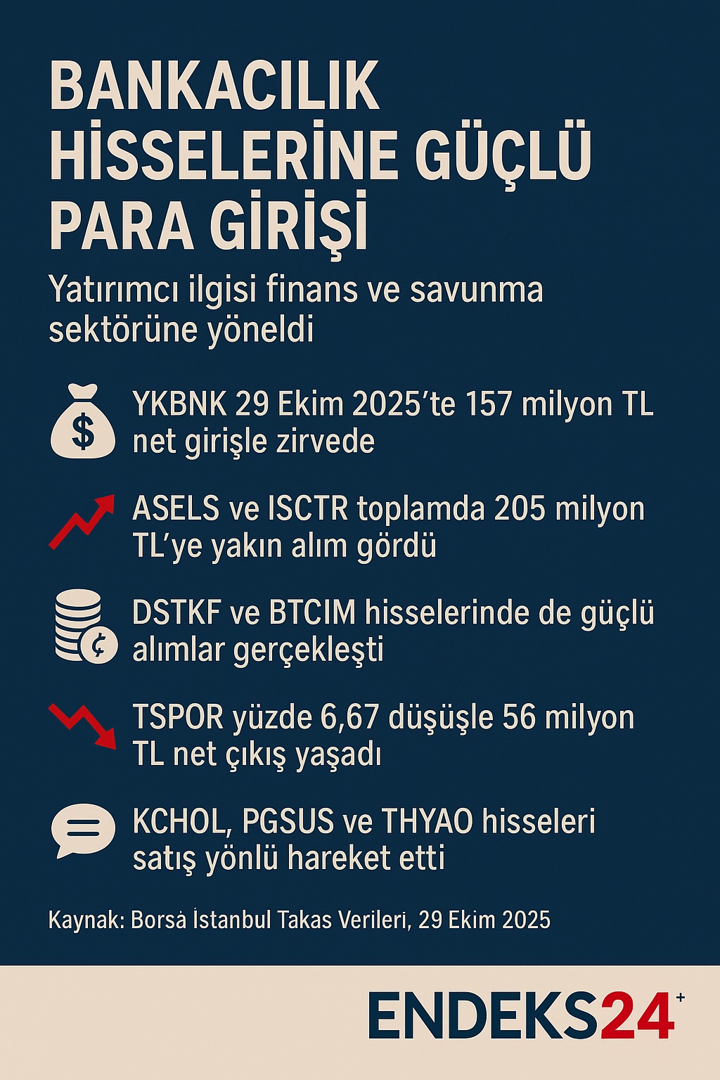 Borsa İstanbulda 29 Ekim 2025 tarihli işlemlerde para akışının yönü bankacılık hisselerine kaydı. Yatırımcıların özellikle büyük ölçekli finans hisselerine ilgisi dikkat çekerken, YKBNK 157 milyon TL’yi aşan net para girişiyle günün zirvesinde yer aldı. ASELS ve ISCTR de en fazla alım gören hisseler arasında öne çıktı.