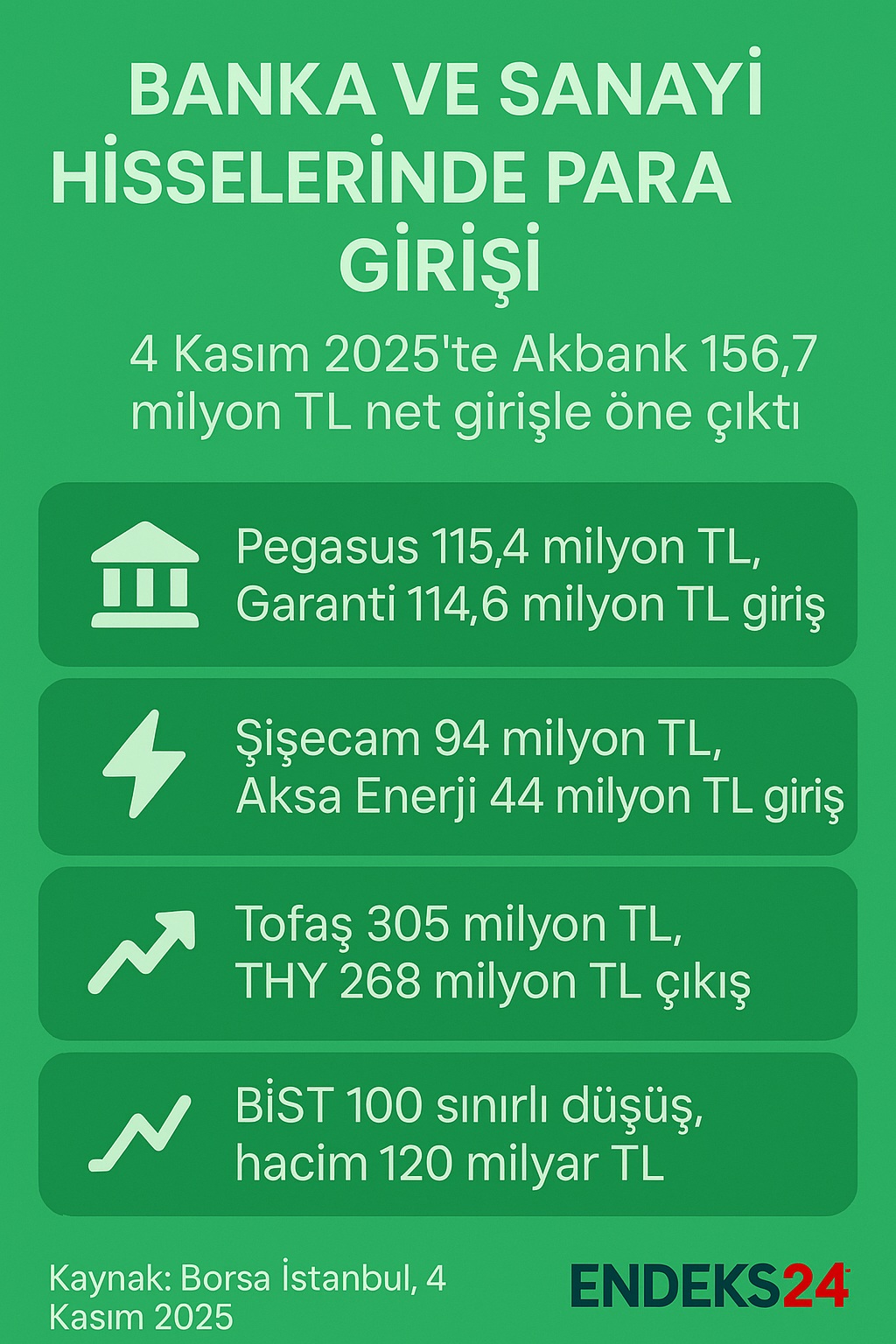 Borsa İstanbulda 4 Kasım 2025 tarihli işlemlerde para akışı bankacılık ve sanayi hisselerinde yoğunlaştı. Gün içinde en yüksek net para girişi 156 milyon 683 bin lira ile Akbank hissesinde gerçekleşti. Bankacılık sektöründeki hareketlilik Garanti Bankası ve Şişecam hisselerinde de etkili oldu.