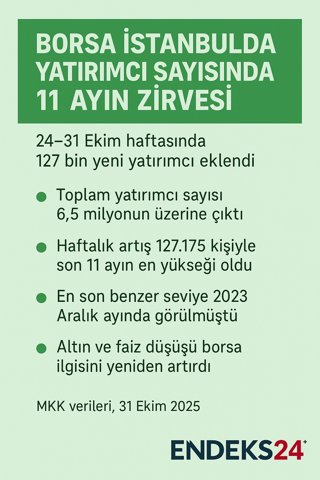 Borsa İstanbul’da yatırımcı sayısı son 11 ayın en hızlı artışını kaydetti. Merkezi Kayıt Kuruluşu (MKK) verilerine göre 24-31 Ekim haftasında borsaya 127 bin 175 yeni yatırımcı eklendi. Böylece toplam yatırımcı sayısı 6 milyon 500 bini aşarak Haziran 2025 seviyelerine geri döndü.