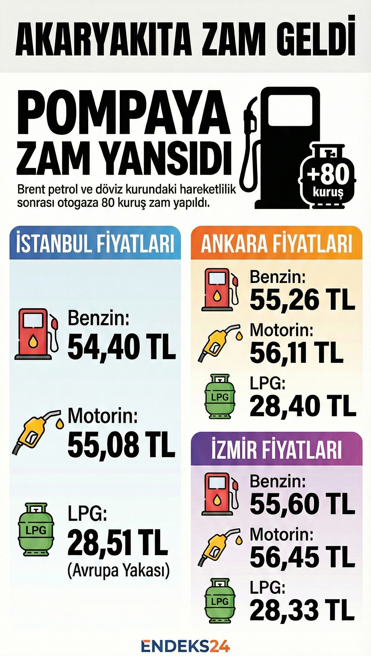 Brent petroldeki dalgalanma, döviz kurundaki değişim ve vergi yüklerindeki artış, akaryakıt fiyatlarını yeniden yukarı çekti. Piyasadaki gelişmelerin ardından otogaz (LPG) litre fiyatına 80 kuruşluk zam uygulandı. Güncelleme pompaya yansırken sürücüler yeni fiyatları takip etmeye başladı.