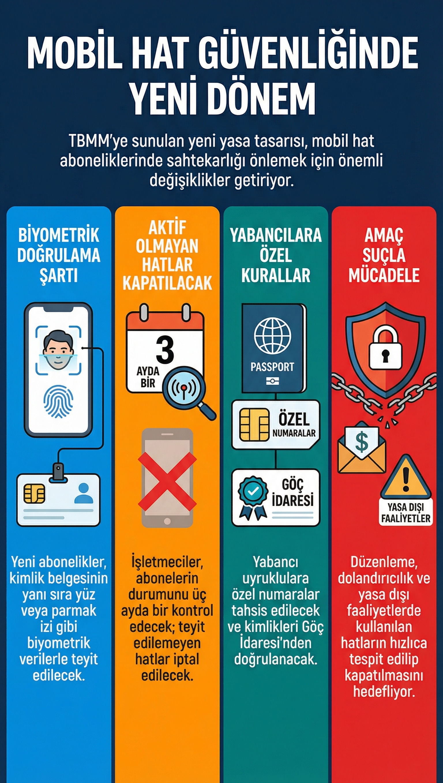 TBMM’ye sunulan torba yasa tasarısı, cep telefonu abonelik süreçlerinde kapsamlı değişiklikler içeriyor. Tasarıya göre aktif olmayan mobil hatlar üç aylık kontrol dönemi sonunda otomatik olarak kapatılacak. Düzenleme, abonelik kimlik doğrulamalarından yabancılara özel hat tahsisine kadar geniş bir alanı kapsıyor.