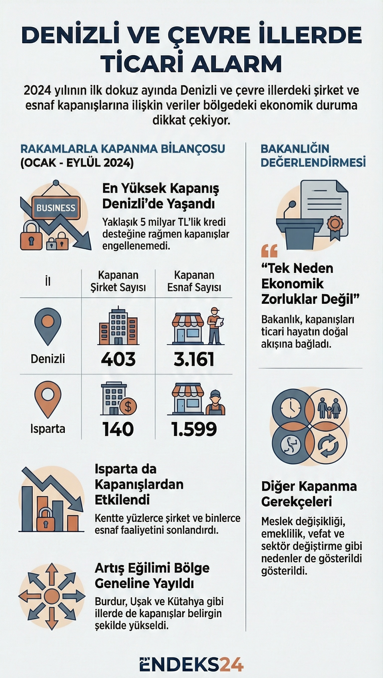 Açıklanan verilere göre 2024 başından 30 Eylül’e kadar kapanışların en yoğun görüldüğü il Denizli oldu. Kentte 403 şirket faaliyetini durdururken, 3.161 esnaf iş yerini kapattı. Halkbank üzerinden sağlanan yaklaşık 4 milyar 963 milyon TL’lik kredi desteğine rağmen kapanış eğiliminin sürdüğü bildirildi.