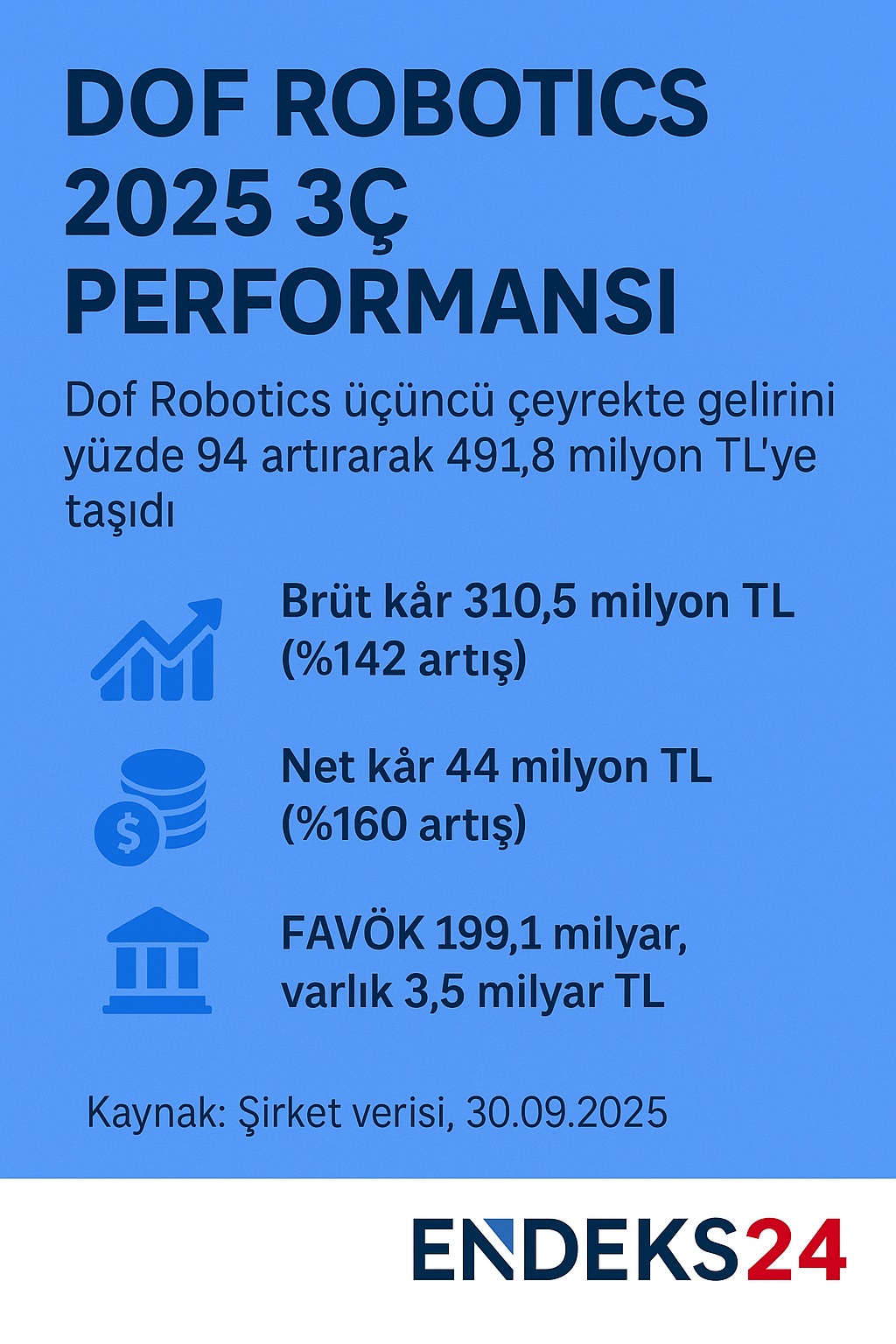 Yüksek teknoloji ve hareket simülasyonu sistemlerinde faaliyet gösteren Dof Robotics, 30 Eylül 2025 itibarıyla açıkladığı finansal sonuçlarla güçlü bir performans sergiledi. Şirketin gelirleri geçen yılın aynı dönemine göre yüzde 94 artarak 491 milyon 806 bin 891 TL’ye ulaştı. Bu artış, Dof Robotics’in ürün çeşitliliği, ihracat hacmi ve operasyonel verimliliğindeki artışla desteklendi.