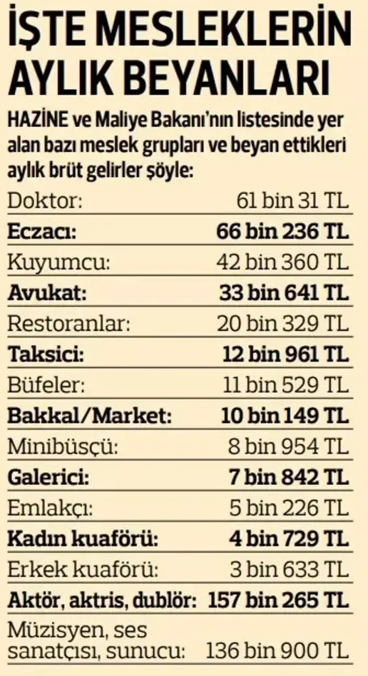 Geçen yıl doktorların ortalama aylık brüt gelir beyanı 61 bin 31 TL, kuyumcuların 42 bin 360 TL, oto galericilerin 7 bin 842 TL olarak kaydedildi. Maliye, bu verilerin faaliyet hacimleriyle örtüşmediğini tespit etti. Bakanlık, düşük beyanın vergi adaletini zedelediğini ve kayıt dışılığın azaltılması için ilave önlem gerektiğini belirtiyor.