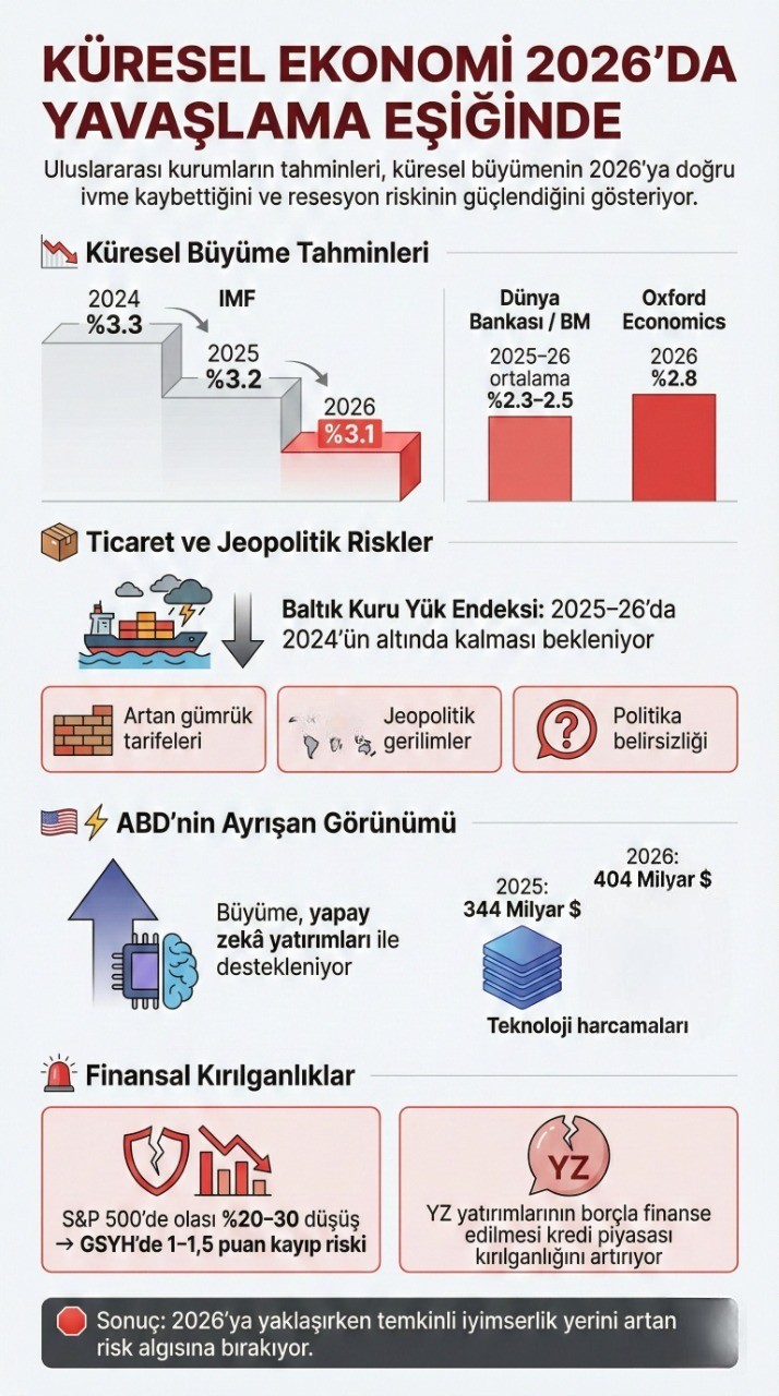 Kurumların ortak projeksiyonları, dünya ekonomisinin 2026’ya zayıflayan büyüme momentumu, artan jeopolitik gerilimler ve finansal kırılganlıklarla ilerlediğini ortaya koyuyor. Bu çerçevede küresel resesyon olasılığının güçlendiği belirtiliyor.