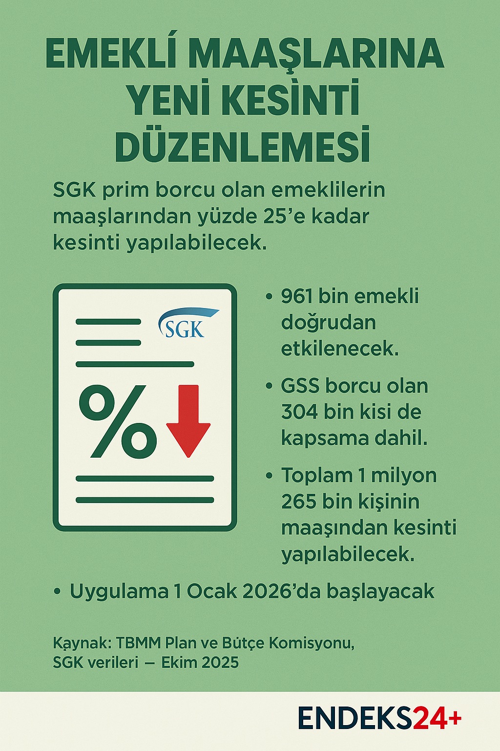 Meclis Plan ve Bütçe Komisyonu’ndan geçen ve Genel Kurul gündemine taşınan yeni vergi düzenlemesi, milyonlarca emekliyi doğrudan etkileyecek. Düzenlemeyle birlikte SGK’ya prim borcu bulunan emeklilerin maaşlarından yüzde 25’e kadar kesinti yapılacak. Yasa teklifinin Meclis’ten geçmesi halinde uygulama 1 Ocak 2026’da başlayacak.