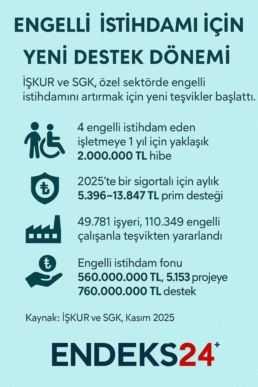 Sosyal Güvenlik Kurumu (SGK) ve İŞKUR tarafından yürütülen bu kapsamlı programla, işverenlere 2025 yılı itibarıyla bir sigortalı için 5.396 ila 13.847 lira arasında prim desteği veriliyor. 1 Eylül 2025 itibarıyla 49 bin 781 işyeri, toplam 110 bin 349 engelli için bu teşvikten faydalanmış durumda. 2008’den bu yana işverenlere yaklaşık 13 milyar TL’lik destek sağlandı.