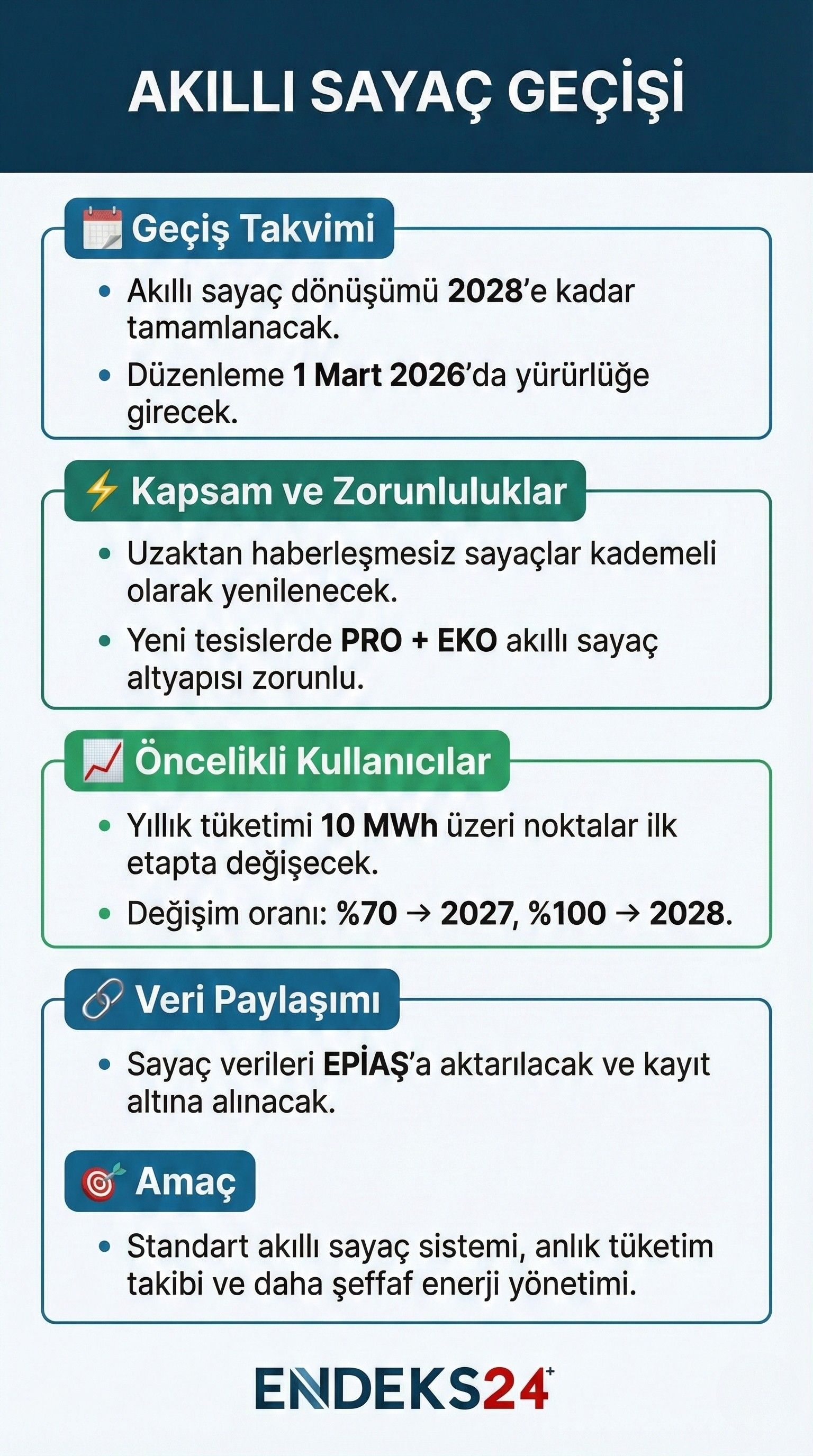 Önceki yıl tüketimi veya yıl içindeki tüketimi 10 megavatsaatin üzerinde olan kullanım noktalarında, uzaktan haberleşme özelliği bulunmayan sayaçlar dağıtım şirketi tarafından Akıllı Sayaç PRO ile değiştirilecek. Bu kapsamdaki değişim oranı 1 Ocak 2027’ye kadar yüzde 70’e, 1 Ocak 2028’e kadar yüzde 100’e ulaşacak.