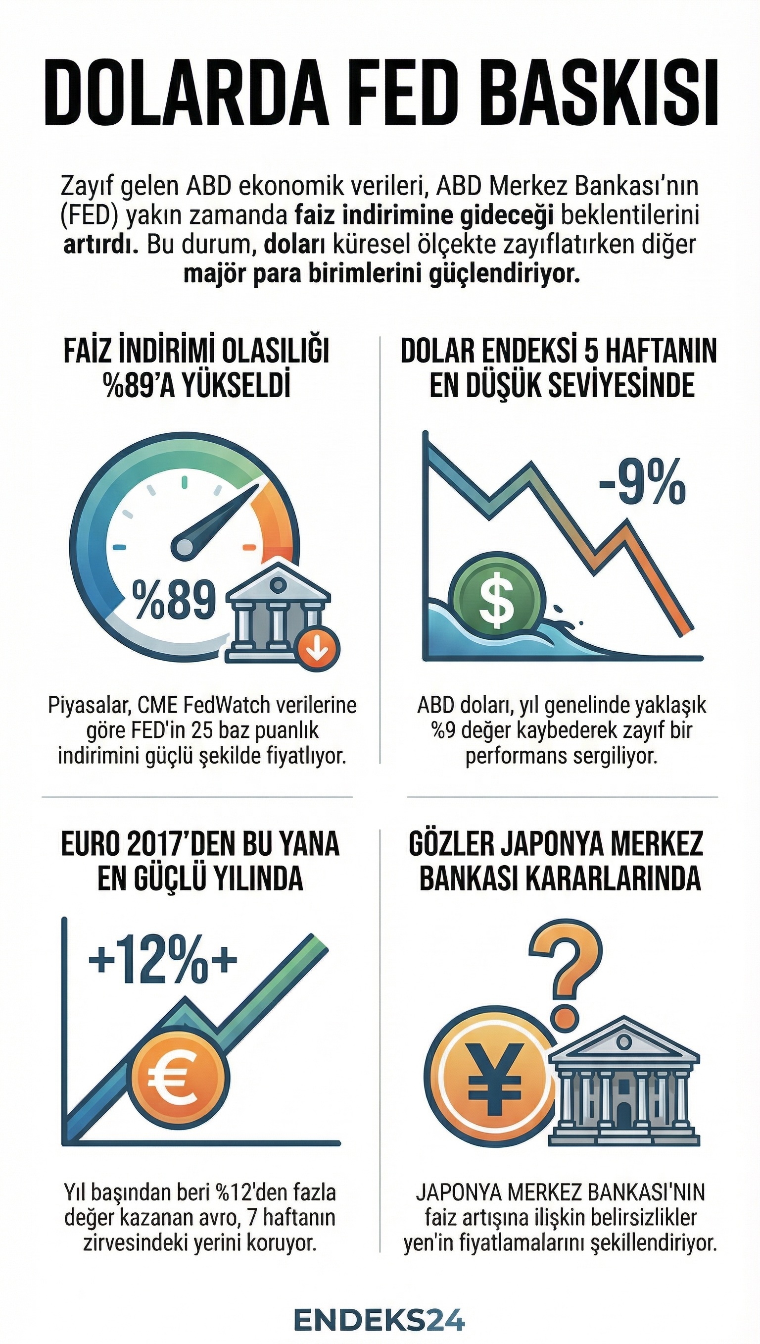 ABD dolar endeksi 98,919 seviyesinde seyrederken, yıl genelinde yaklaşık %9 değer kaybı kaydetti. Reuters anketine göre stratejistlerin çoğunluğu, faiz indirimi beklentileri nedeniyle 2026’da doların zayıflayacağı tahminini koruyor.