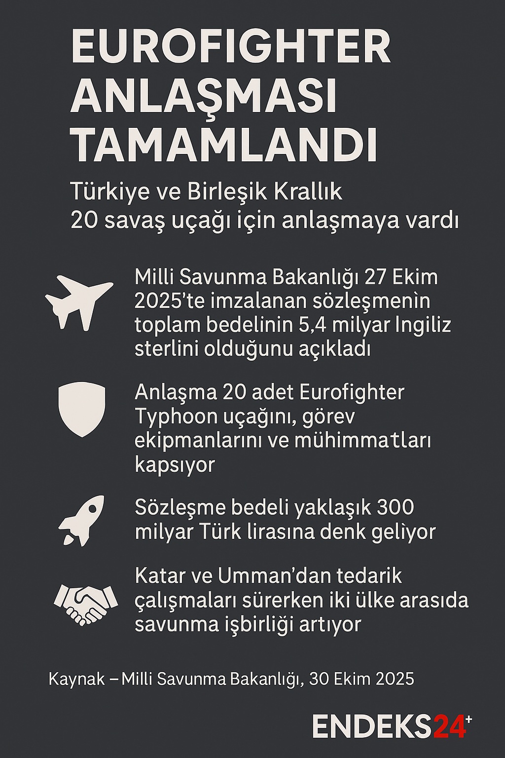Milli Savunma Bakanlığı (MSB), Eurofighter Typhoon savaş uçağı tedariki kapsamında Birleşik Krallık ile imzalanan anlaşmanın toplam bedelinin 5,4 milyar İngiliz sterlini olduğunu bildirdi. Bakanlık açıklamasında, 27 Ekim tarihinde imzalanan sözleşmenin 20 adet yeni üretim Eurofighter Typhoon savaş uçağını, uçaklara ait görev ekipmanlarını ve çeşitli mühimmatları kapsadığı ifade edildi.