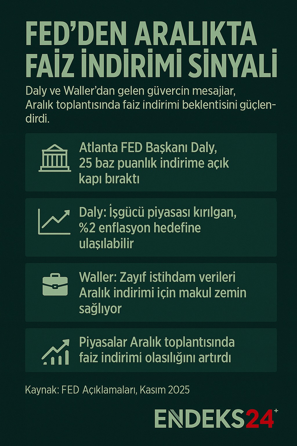 ABD MERKEZ BANKASI'nın (FED) Aralık toplantısına yönelik faiz indirimi beklentileri son günlerde hız kazandı. Daha önce düşük olasılık olarak görülen indirim senaryosu, yetkililerden gelen güvercin mesajlarla yeniden ön plana çıktı.
