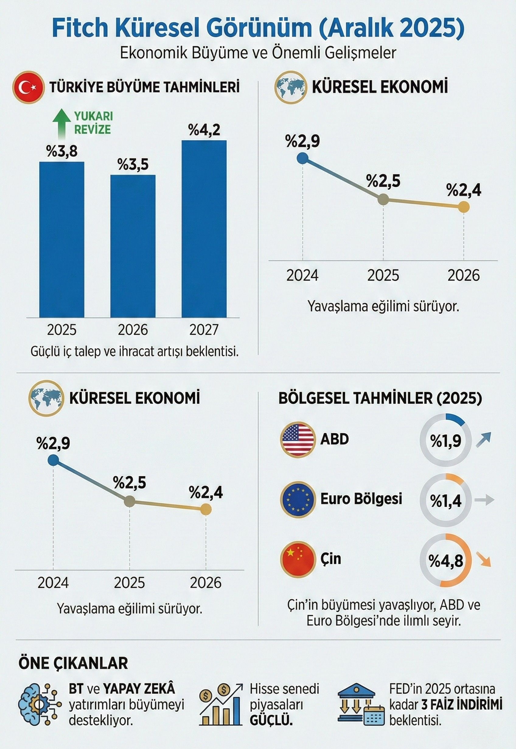 Fitch Ratings’in aralık dönemine ilişkin Küresel Ekonomik Görünüm Raporu, bilgi teknolojisi yatırımlarındaki artışın ve hisse senedi piyasalarındaki güçlü seyrin küresel ekonomiye desteğini ortaya koydu. Raporda, küresel büyüme tahminleri 2025 ve 2026 için yukarı güncellenirken, Türkiye ekonomisine ilişkin beklentilerin de revize edildiği bildirildi.