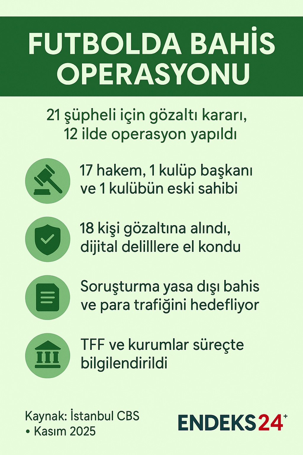 İstanbul Cumhuriyet Başsavcılığı, Türkiye Futbol Federasyonu (TFF) Başkanı İbrahim Hacıosmanoğlu’nun açıklamasını ihbar kabul ederek futbolda geniş kapsamlı bir bahis soruşturması başlattı. Başsavcılık tarafından yürütülen operasyon kapsamında 17 hakem ile Eyüpspor Başkanı Murat Özkaya ve Kasımpaşaspor’un eski başkanı Mehmet Fatih Saraç’ın da aralarında bulunduğu toplam 21 kişi gözaltına alındı.