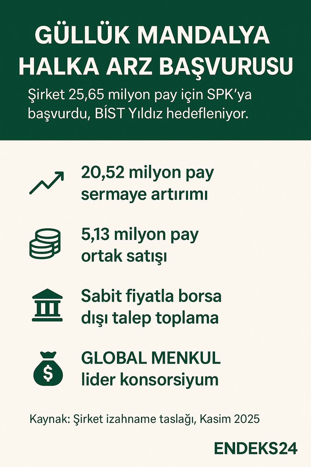 Güllük Mandalya Turizm ve Liman Hizmetleri A.Ş., halka arz sürecine yönelik başvurusunu SPK’ya gerçekleştirdi. Şirket tarafından bildirilen taslak izahnameye göre 25.650.000 adet payın halka arzı planlanıyor. Bu kapsamda 20.520.000 adet pay sermaye artırımı, kalan kısım ise ortak satışı olarak yapılandırıldı.