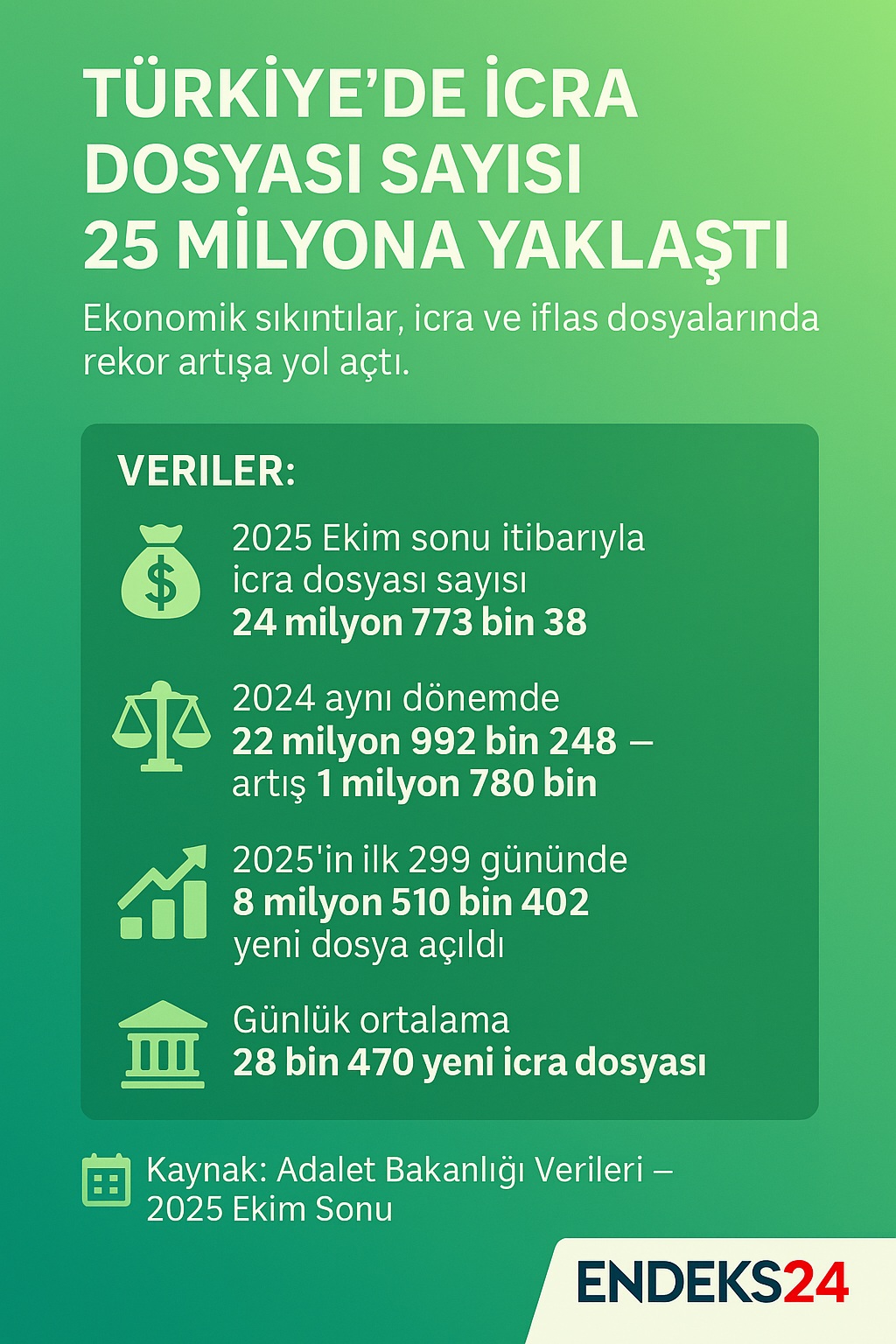 Türkiye’de icra dosyası sayısında hızlı artış yaşandı. İcra ve iflas dairelerinde kayıtlı dosya sayısı 2025 ekim ayı sonu itibarıyla 24 milyon 773 bin 38’e yükseldi. Geçen yıl aynı dönemde bu rakam 22 milyon 992 bin 248 olarak kaydedilmişti. Böylece bir yılda yaklaşık 1 milyon 780 bin yeni icra dosyası sisteme girmiş oldu.