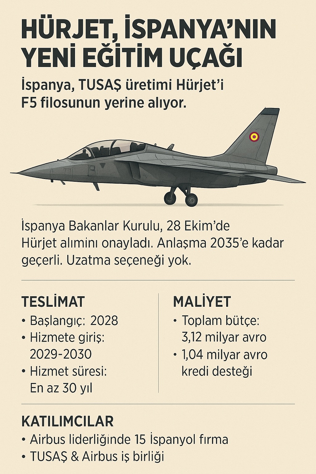 İspanya Hükümeti, Türk Havacılık ve Uzay Sanayii AŞ (Tusaş) tarafından geliştirilen Türkiye’nin ilk yerli jet eğitim ve hafif taarruz uçağı Hürjet’in satın alımına onay verdi. Bakanlar Kurulu’nun 28 Ekim’de gerçekleştirdiği toplantıda alınan karara göre Hürjet, İspanya Hava Kuvvetleri’nin yeni eğitim uçağı olarak F5 filosunun yerini alacak. Projenin toplam maliyetinin 3 milyar 120 milyon avro olduğu açıklandı.