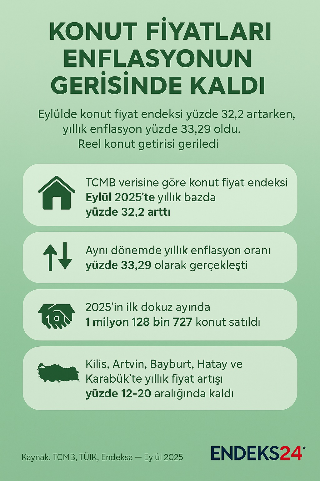 Türkiye genelinde konut fiyat artışları, eylül ayında açıklanan yıllık enflasyon oranının gerisinde kaldı. Türkiye Cumhuriyet Merkez Bankası (TCMB) verilerine göre konut fiyat endeksi eylülde yıllık bazda yüzde 32,2 arttı. Aynı dönemde yıllık enflasyon yüzde 33,29 olarak gerçekleşti. Böylece reel anlamda konut fiyatlarında sınırlı bir gerileme gözlendi.