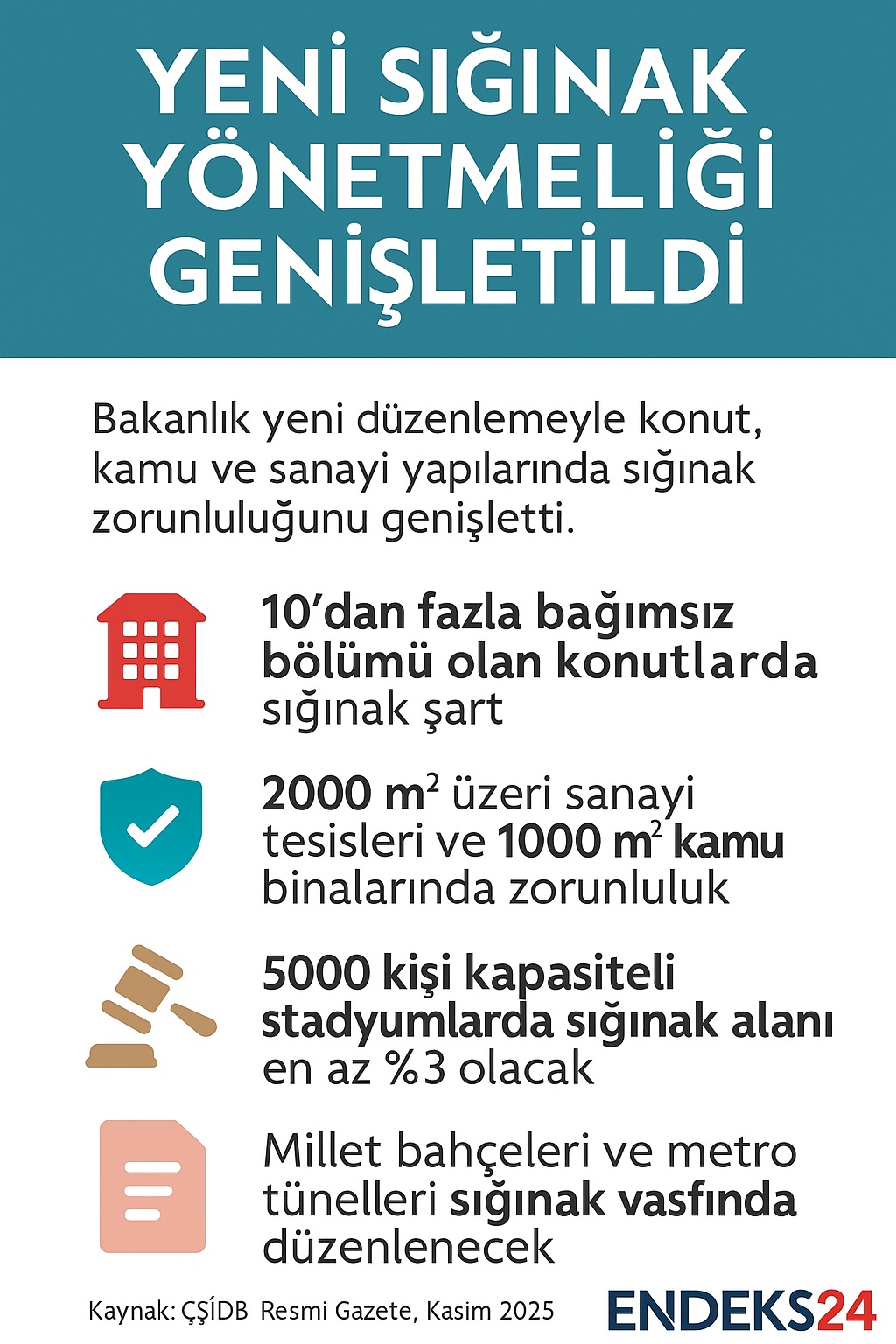 Yeni yönetmeliğe göre, toplam bağımsız bölüm sayısı 10’dan fazla olan konutlarda, 50 yatak üzeri yurt, koğuş, otel ve diğer konaklama tesislerinde sığınak yapılması zorunlu olacak. Ayrıca, 25 yatak üzeri kapasiteye sahip yaşlı, çocuk veya engelli bakım merkezleri ile yataklı sağlık tesislerinde de aynı koşul aranacak.