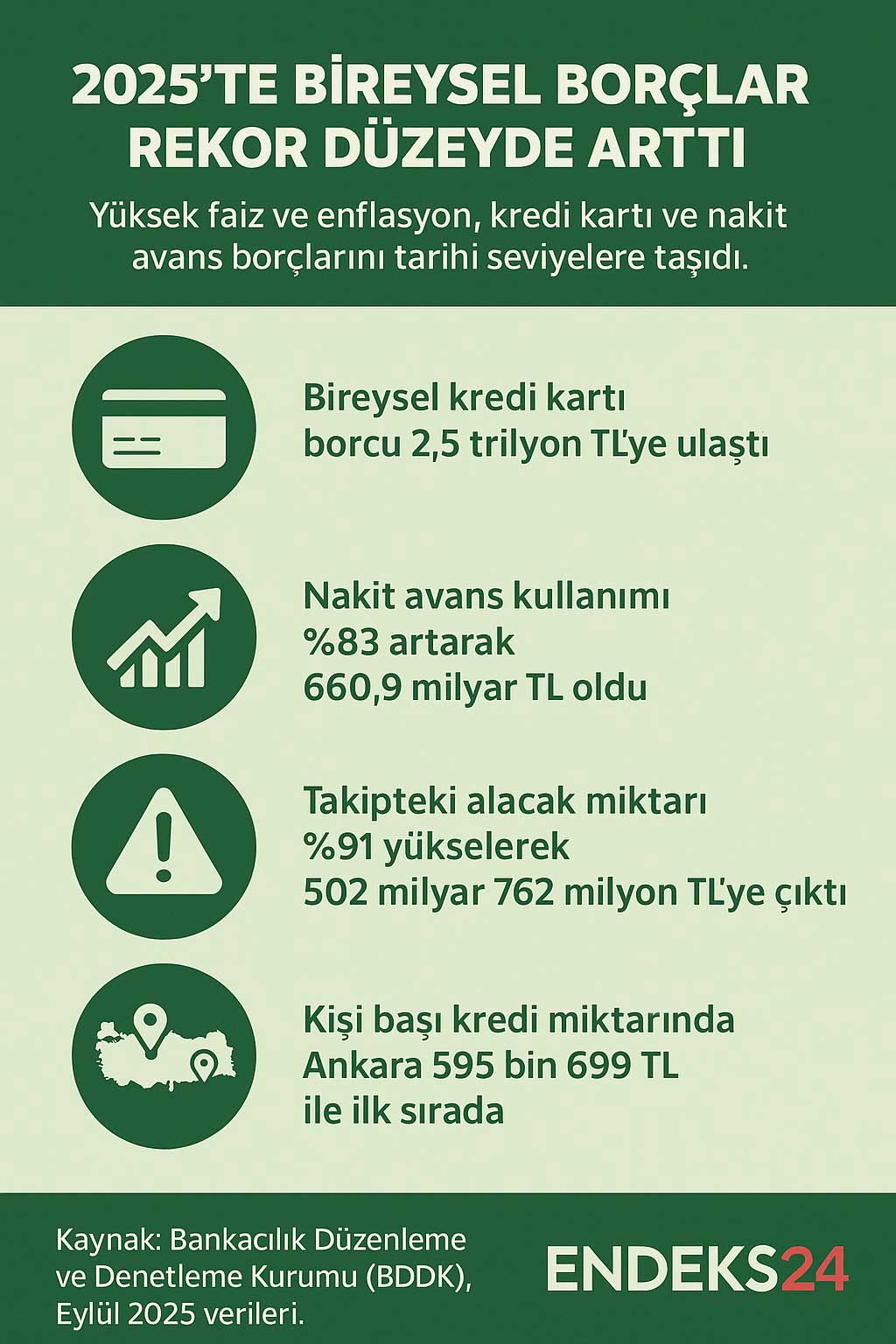 Yüksek faiz ve enflasyonun etkisiyle vatandaşların borçlanma eğilimi hızla artıyor. Bankacılık Düzenleme ve Denetleme Kurumu’nun (BDDK) 2025 yılı eylül dönemi verilerine göre, bireysel kredi kartı borcu 2.5 trilyon lirayı aşarken, nakit avans kullanımında da rekor artış yaşandı. Verilere göre, nakit avans tutarı geçen yılın aynı dönemine göre yüzde 83 yükselerek 660.9 milyar liraya çıktı.