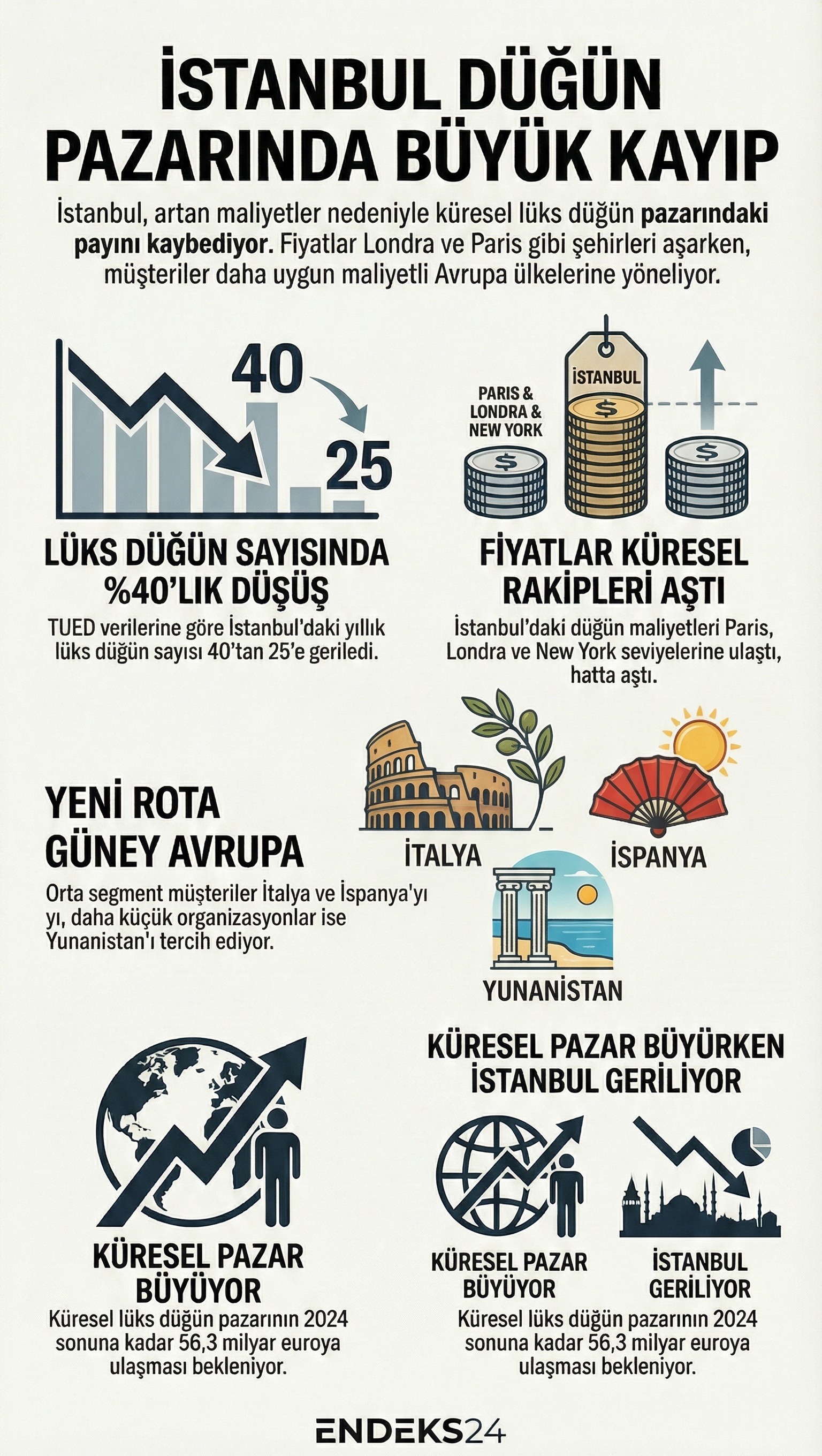Küresel lüks düğün pazarı büyürken İstanbul’da orta segment başta olmak üzere talepte gerileme yaşanıyor. Türkiye Uluslararası Etkinlikler Derneği (TUED) verilerine göre fiyatların Londra, Paris ve New York seviyelerini aşması, orta ölçekli düğünlerin ülkeyi terk etmesine neden oldu.