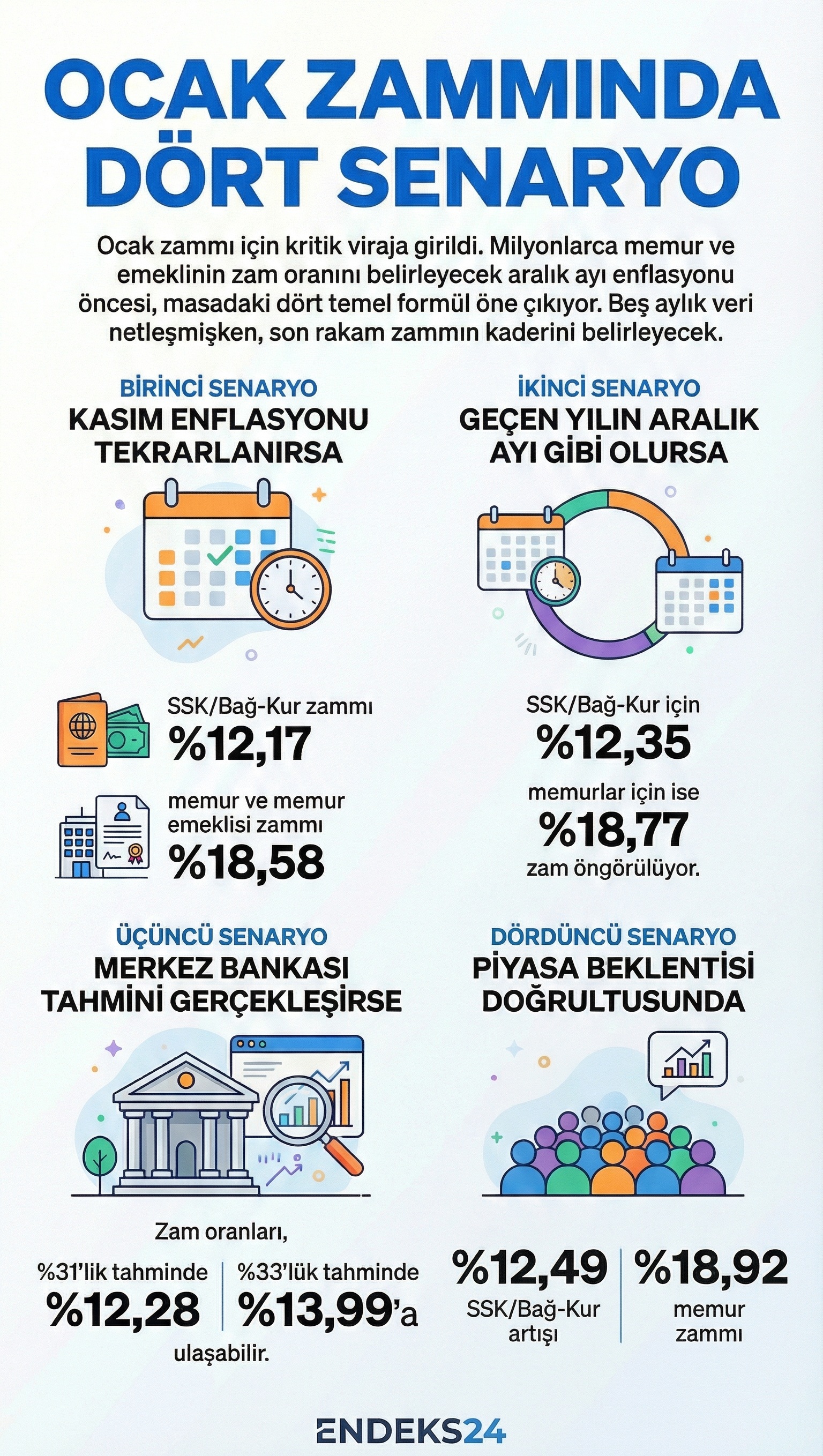 Zam oranlarını tamamlayacak aralık enflasyonu ay başında açıklanacak. Mevcut veriler, ocak döneminde SSK ve Bağ-Kur emeklilerinde yüzde 12 bandında, memurlar ve memur emeklilerinde ise yüzde 18 civarında artış ihtimalini öne çıkarıyor.