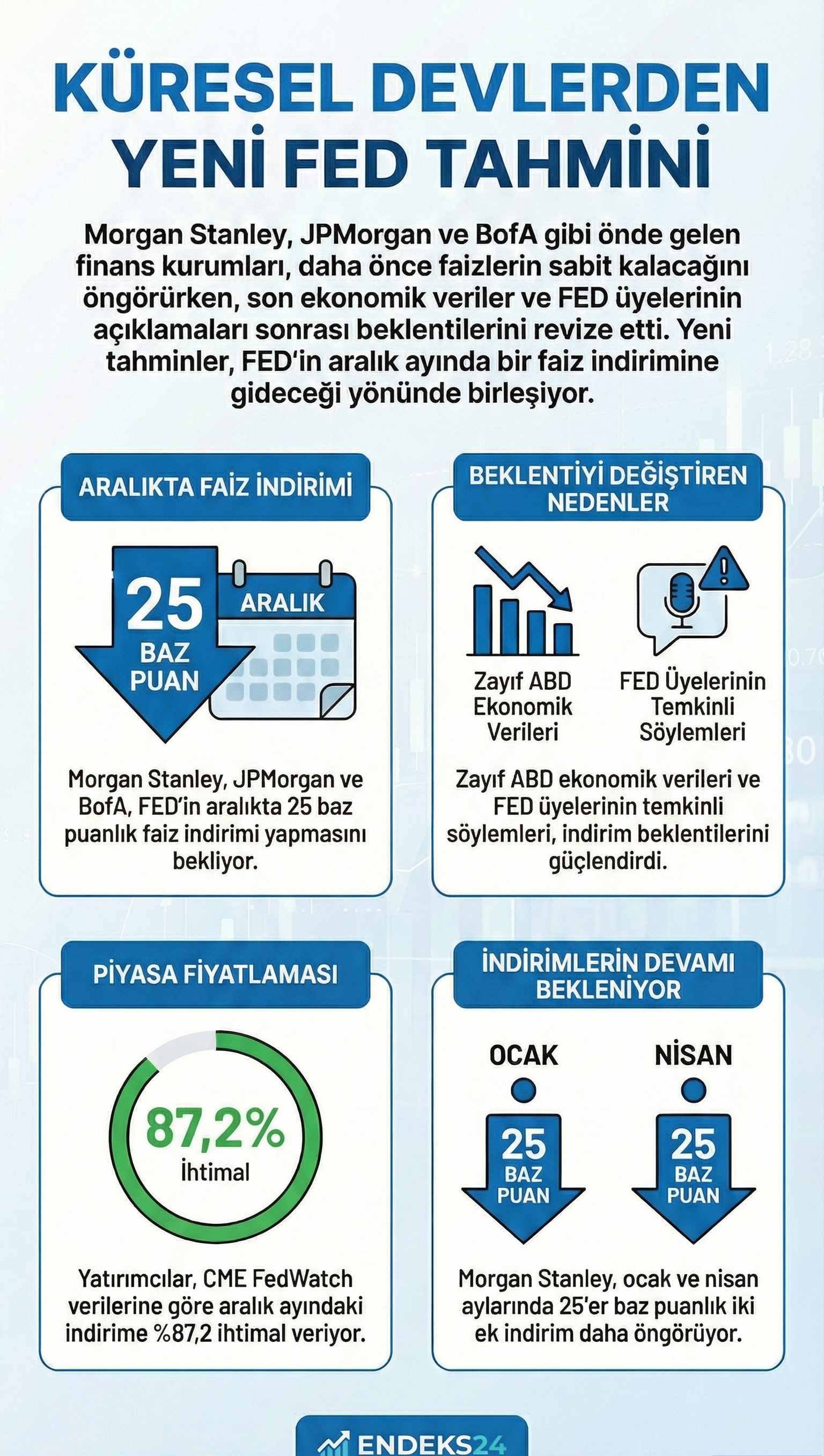 Morgan Stanley, merkez bankası yetkililerinin son dönemde yaptığı ılımlı açıklamaların ardından FED’in aralık toplantısında 25 baz puanlık faiz indirimi öngördüğünü bildirdi. Açıklama, JPMorgan ve BofA Global Research’ün güncellenen projeksiyonlarıyla aynı doğrultuda yer aldı.