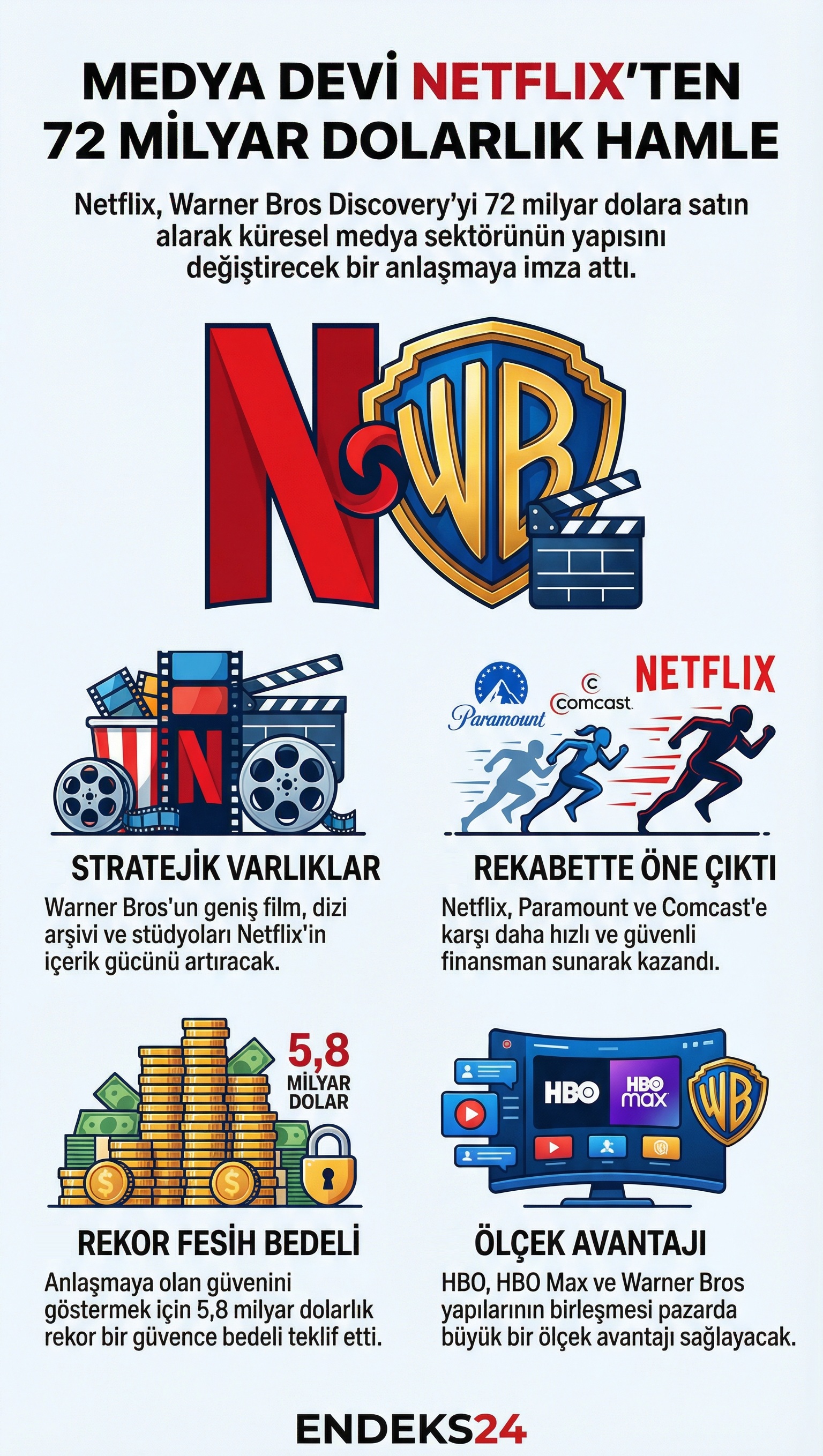 Reuters’a konuşan sürece yakın kaynaklar, Netflix’in Warner Bros Discovery’yi 72 milyar dolara satın almak üzere anlaşmaya vardığını ve sürecin küresel medya sektörünün yapısını değiştirecek ölçekte olduğunu bildirdi. Anlaşma, büyük stüdyo varlıklarının yeniden konumlandığı dönemde müzakerelerin 1 Aralık son tarihine kadar yoğun şekilde yürütülmesiyle şekillendi.