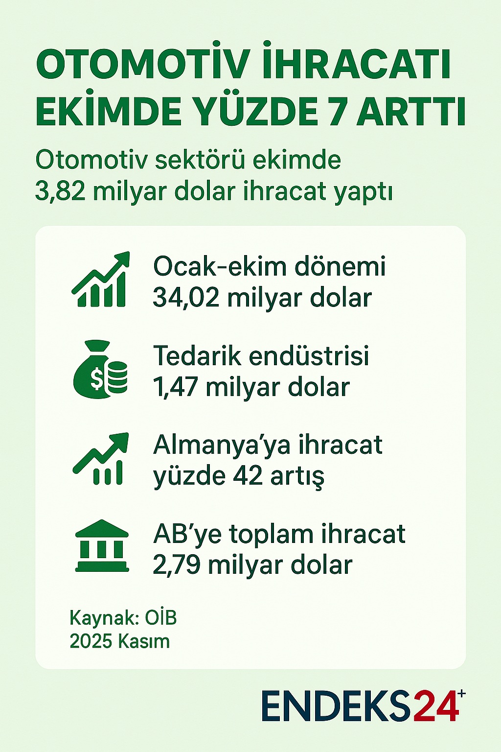 Uludağ Otomotiv Endüstrisi İhracatçıları Birliği (OİB) verilerine göre, Türkiye’nin ihracat lideri olan otomotiv endüstrisi ekim ayında geçen yılın aynı dönemine kıyasla yüzde 7 artışla 3 milyar 816 milyon dolarlık dış satım gerçekleştirdi. Sektörün ocak-ekim dönemindeki toplam ihracatı ise yüzde 11,6 artarak 34 milyar 19 milyon dolara ulaştı.