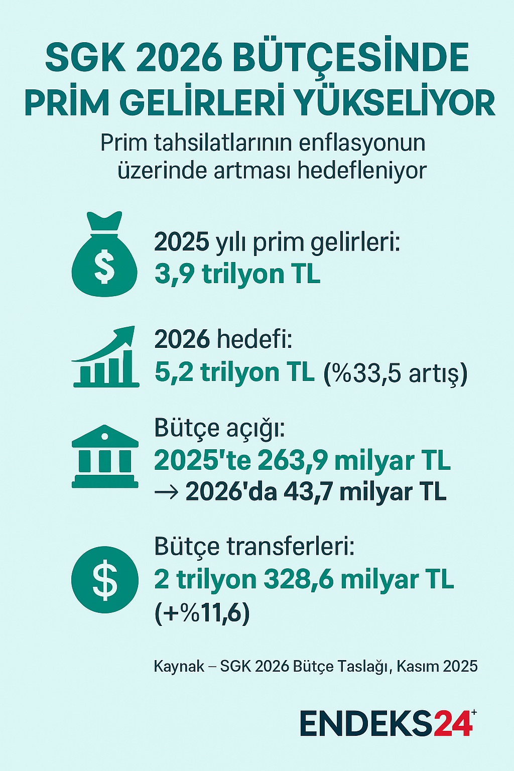 Sosyal Güvenlik Kurumu’nun (SGK) 2026 yılı bütçesinde gelirlerin önemli bölümünü oluşturan prim tahsilatlarının yüzde 33,5 oranında artması bekleniyor. Kurumun prim gelirleri 2025 yılında 3,9 trilyon lira düzeyindeyken, 2026’da 5,2 trilyon liraya yükselmesi hedefleniyor. Bu artış, SGK’nın toplam gelirlerinin 6,9 trilyon liraya ulaşmasında belirleyici rol oynayacak.