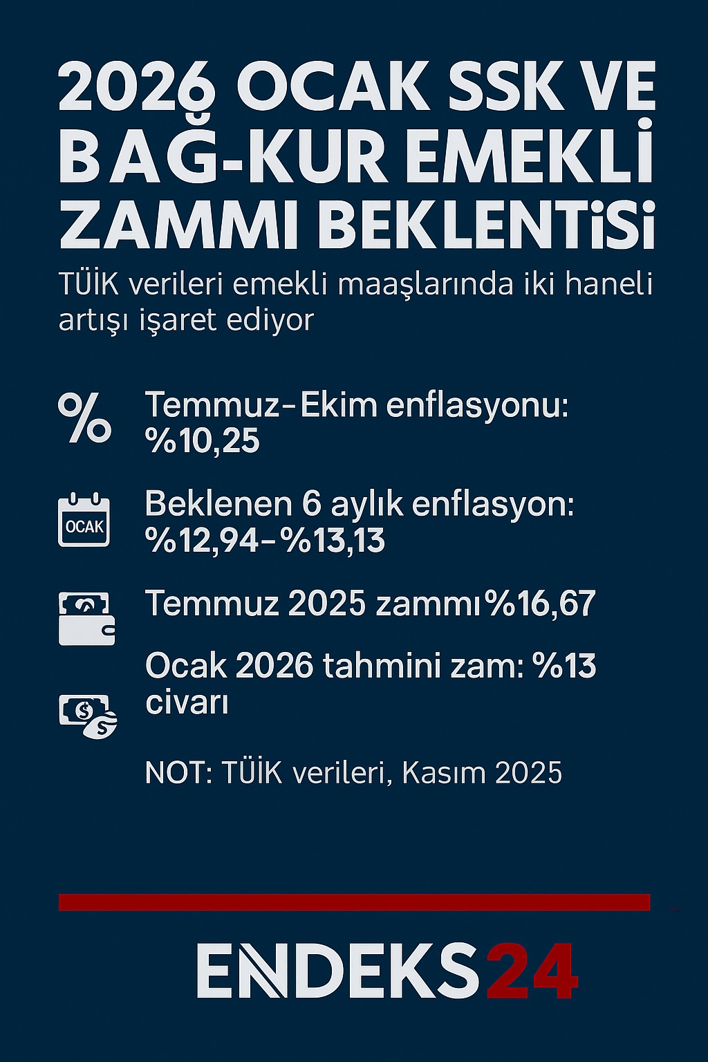 Kasım ve aralık ayı enflasyon verilerinin açıklanmasıyla nihai zam oranı kesinleşecek. Yıl sonu enflasyonunun yüzde 13’ün üzerine çıkması halinde SSK ve Bağ-Kur emeklilerinin 2026 ocak maaş artışı da aynı oranda yükselecek. TÜİK verilerine göre enflasyonun seyrine bağlı olarak oran yüzde 13 bandına yaklaşmış durumda.