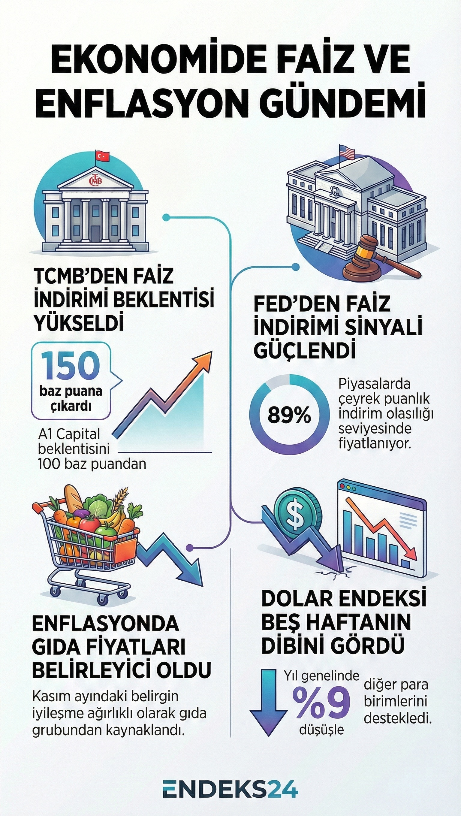 A1 CAPITAL, Kasım ayı enflasyonunun beklentilerin belirgin şekilde altında kalmasının ardından para politikası projeksiyonlarını güncelledi. Bültene göre kurum, gelecek hafta yapılacak TCMB toplantısında faiz indirimi beklentisini 100 baz puandan 150 baz puana yükseltti.