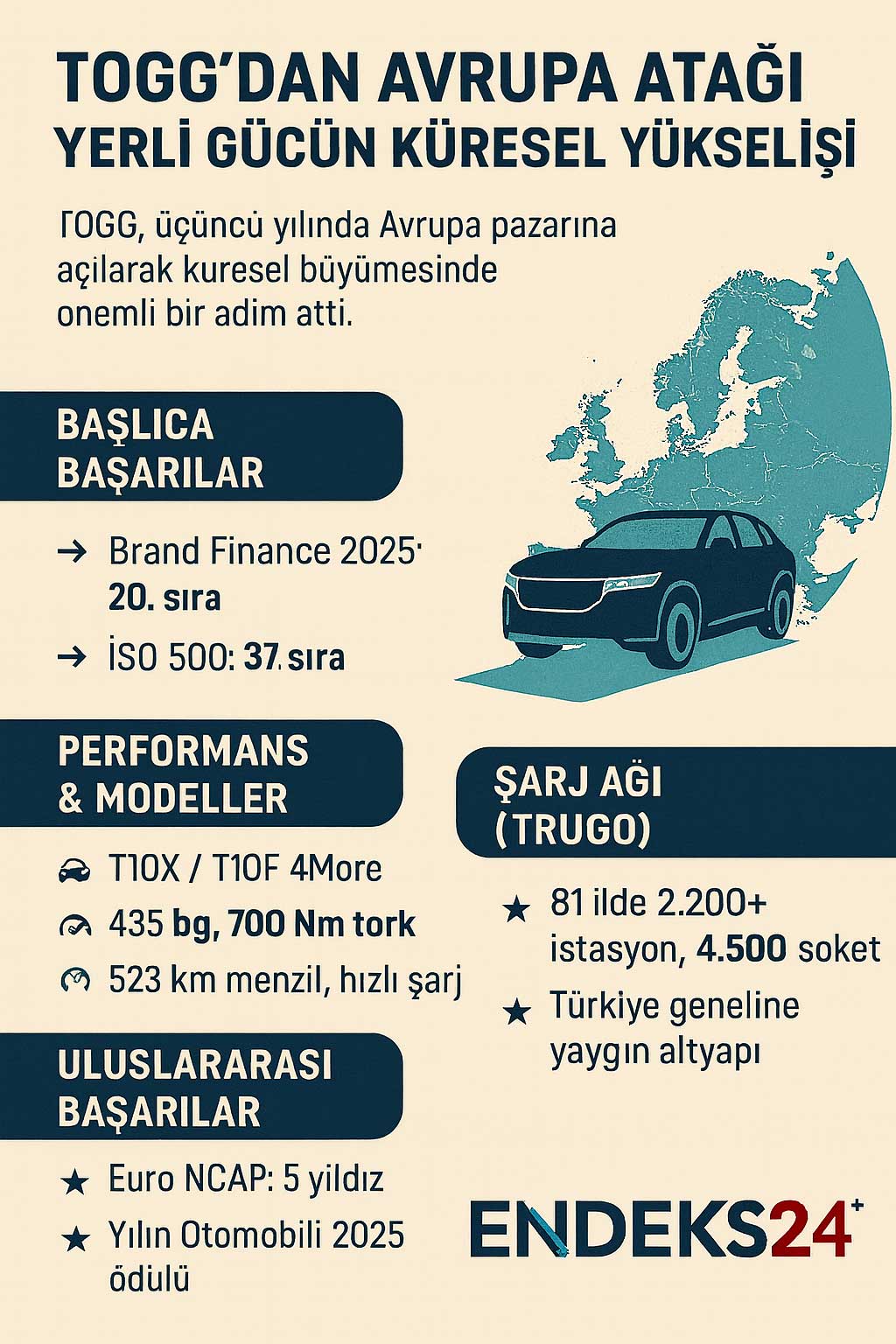 Otomotiv Distribütörleri ve Mobilite Derneği (ODMD) verilerine göre TOGG, Türkiye’de satılan her beş elektrikli otomobilden birini temsil ediyor. 2024 yılında 30 bin 93 araç satan şirket, 2025’in ocak-eylül döneminde 23 bin 325 satışa ulaştı. Yeni modeli T10F’in Türkiye ve Almanya’da satışa sunulmasıyla birlikte Avrupa pazarında da hızlı bir ivme yakaladı.