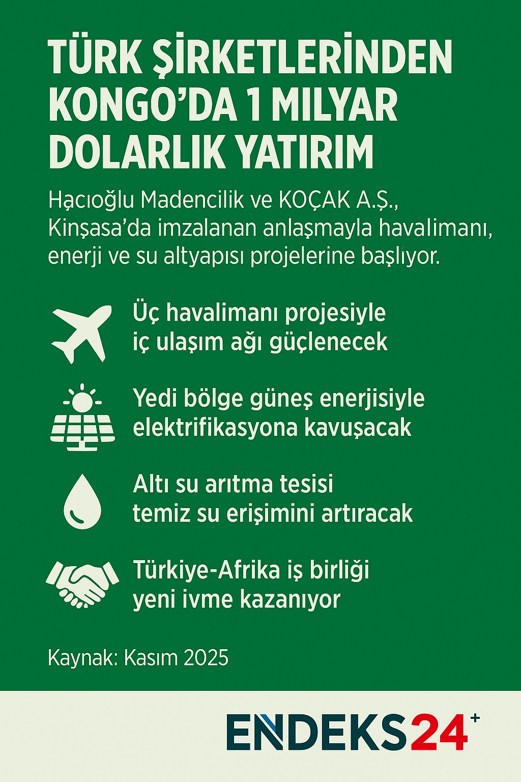 Türk şirketleri Hacıoğlu Madencilik ve KOÇAK A.Ş., Demokratik Kongo Cumhuriyeti’nde toplam 1 milyar dolar büyüklüğündeki yatırım paketini başkent Kinşasa’da imzaladı. Paket; üç havalimanı yapımı, yedi bölgenin güneş enerjisiyle elektrifikasyonu ve içme suyu altyapı projelerini içeriyor.