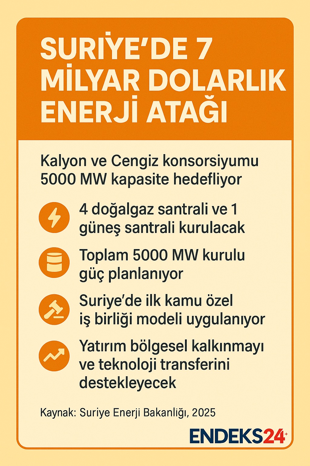 Kalyon Holding ve Cengiz Holding’in de içinde bulunduğu uluslararası konsorsiyum, Suriye’de 7 milyar dolar değerindeki stratejik enerji yatırımında uygulama aşamasına geçti. Suriye Enerji Bakanlığı ile imzalanan sözleşme kapsamında gerçekleştirilecek projede dört doğalgaz kombine çevrim santrali ve bir güneş santrali kurulacak. Toplam 5000 MW kurulu güce ulaşması hedeflenen proje, ülkenin enerji arz güvenliğini güçlendirmeyi amaçlıyor.