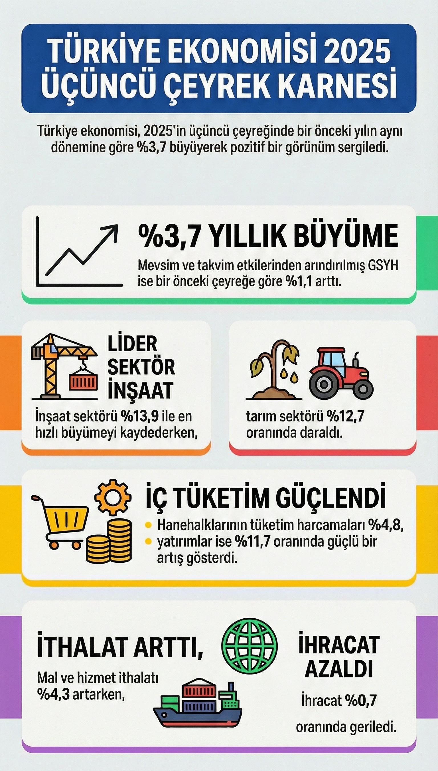 TÜİK, 2025 yılı üçüncü çeyrek GSYH verilerini yayımladı. Zincirlenmiş hacim endeksi bazlı ilk tahmine göre ekonomi bir önceki yılın aynı dönemine göre %3,7 büyüme kaydetti. Mevsim ve takvim etkilerinden arındırılmış GSYH ise bir önceki çeyreğe göre %1,1 arttı.