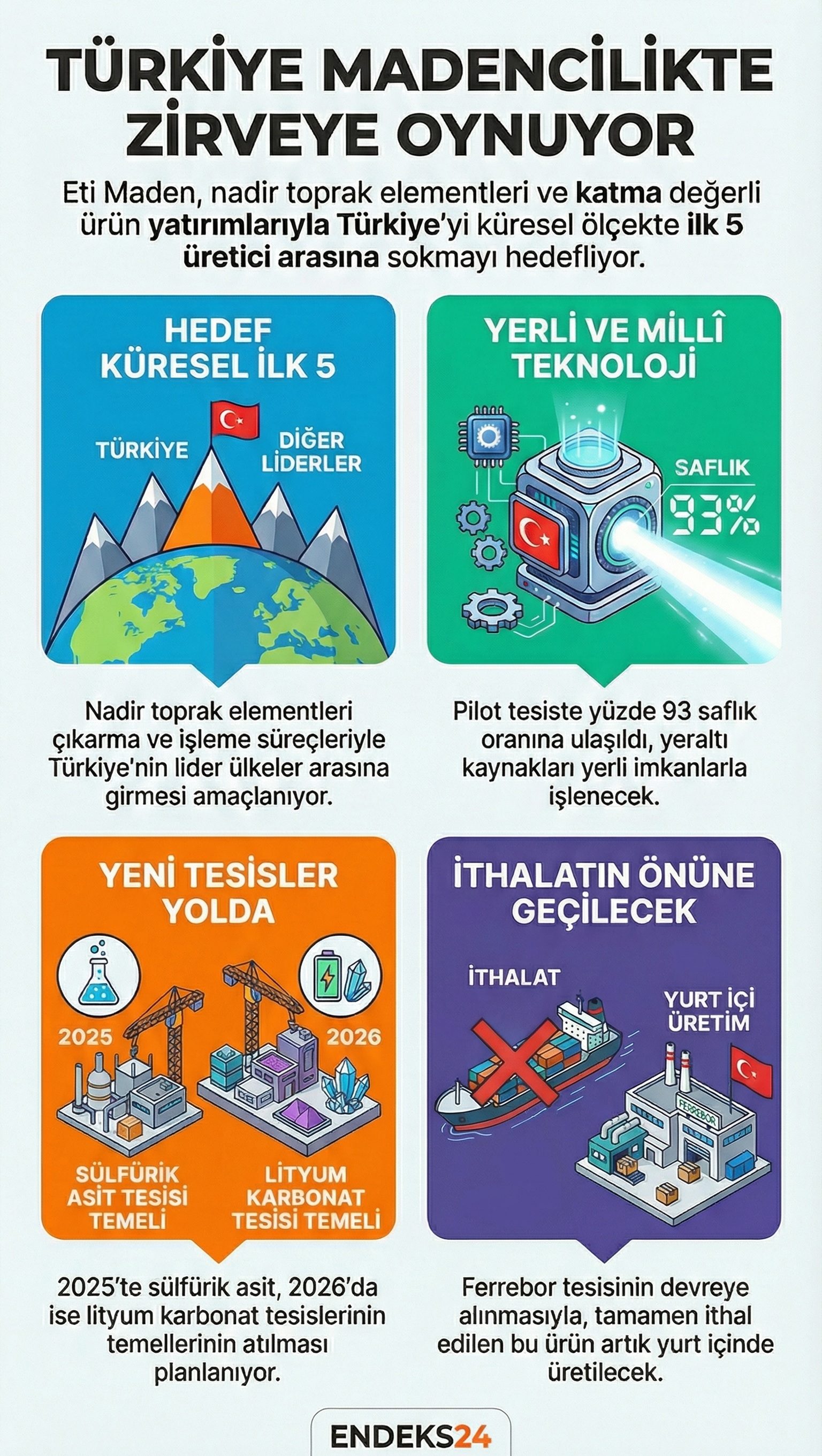 Aydın, pilot tesis çalışmalarının 2023 yılından bu yana sürdüğünü ve saflaştırma seviyesinin yüzde 92–93 bandına ulaştığını ifade etti. Yer altı kaynaklarının işlenmesinde yerli ve millî teknoloji kullanımının stratejinin merkezinde olduğu bildirildi.