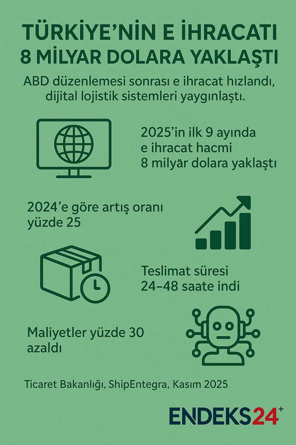 Ticaret Bakanlığı verilerine göre, Türkiye’nin e ihracat hacmi 2025’in ilk dokuz ayında yüzde 3,2 paya ulaşarak 8 milyar dolar seviyesine yaklaştı. 2024 yılında 6,4 milyar dolar olarak gerçekleşen e ihracat, bu yılın aynı döneminde yüzde 25’e yakın artış kaydetti. Bakanlık hedefi, 2025 sonunda toplam ihracat içinde e ihracat payının 8 milyar dolar seviyesine ulaşması yönünde belirlendi.