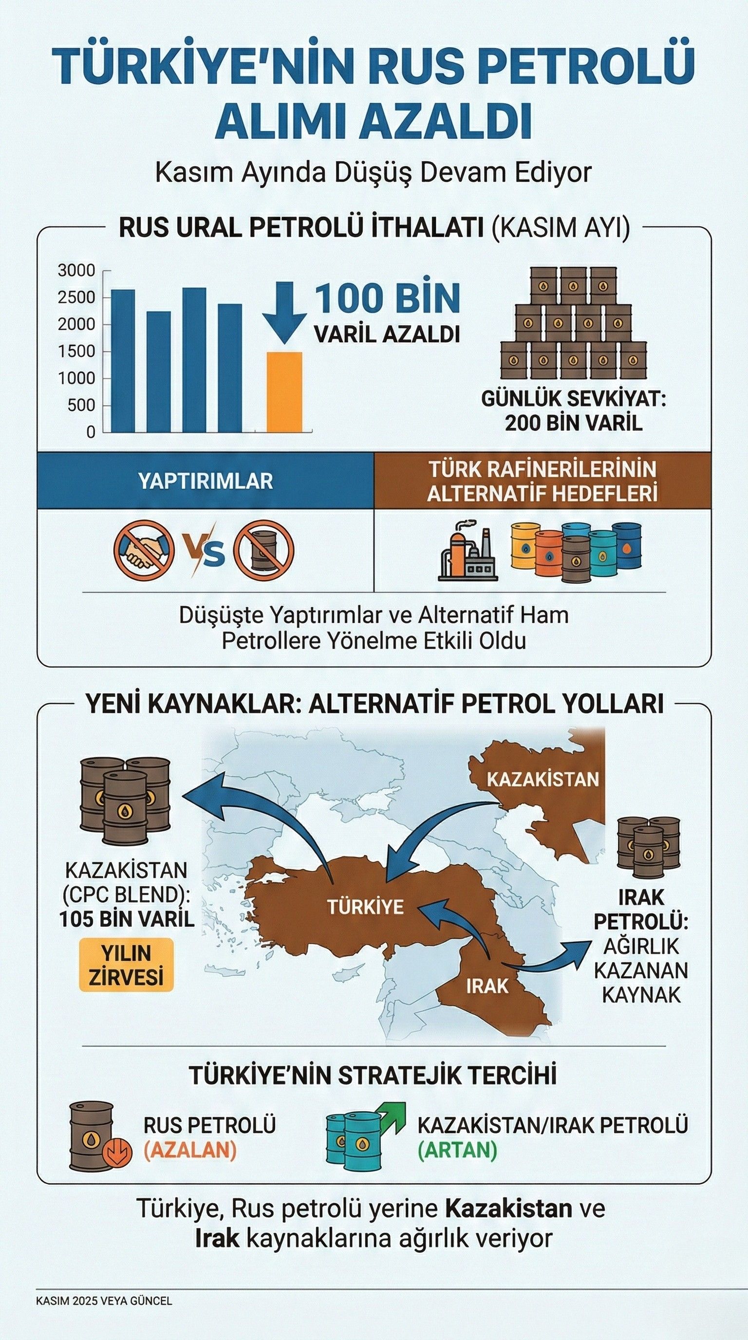 Kasım ayında Türkiye’nin Rusya’dan ithal ettiği Ural petrolü sert şekilde geriledi. KPLER ve LSEG verilerine göre aylık bazda 100 bin varillik düşüş yaşanırken, sevkiyatlar günlük 200 bin varil civarına indi. Düşüşte Batılı ülkelerin Rus enerji tedarikçilerine yönelik yaptırımları ve Türk rafinerilerinin alternatif ham petrol türlerine yönelmesi etkili oldu.