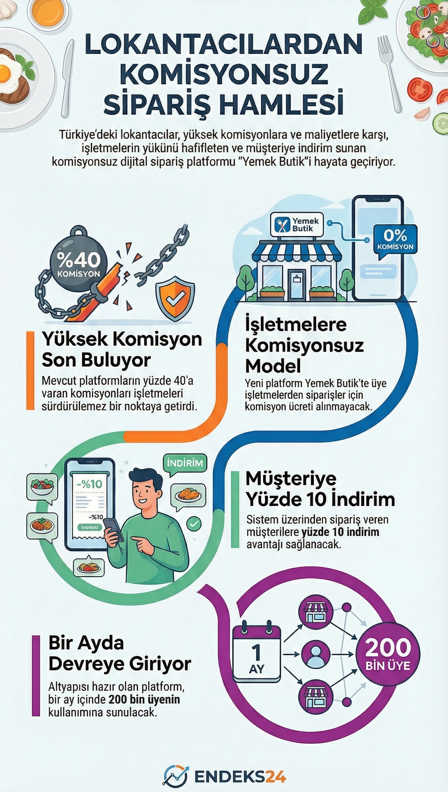 Türkiye Lokantacılar ve Pastacılar Federasyonu Genel Başkanı Sayit Karabağlı, yüksek komisyon oranlarına karşı alternatif bir dijital sipariş platformu olarak Yemek Butik sisteminin geliştirildiğini açıkladı. Karabağlı, altyapısı tamamlanan platformun bir ay içinde 200 bin üyenin kullanımına açılacağını belirtti.