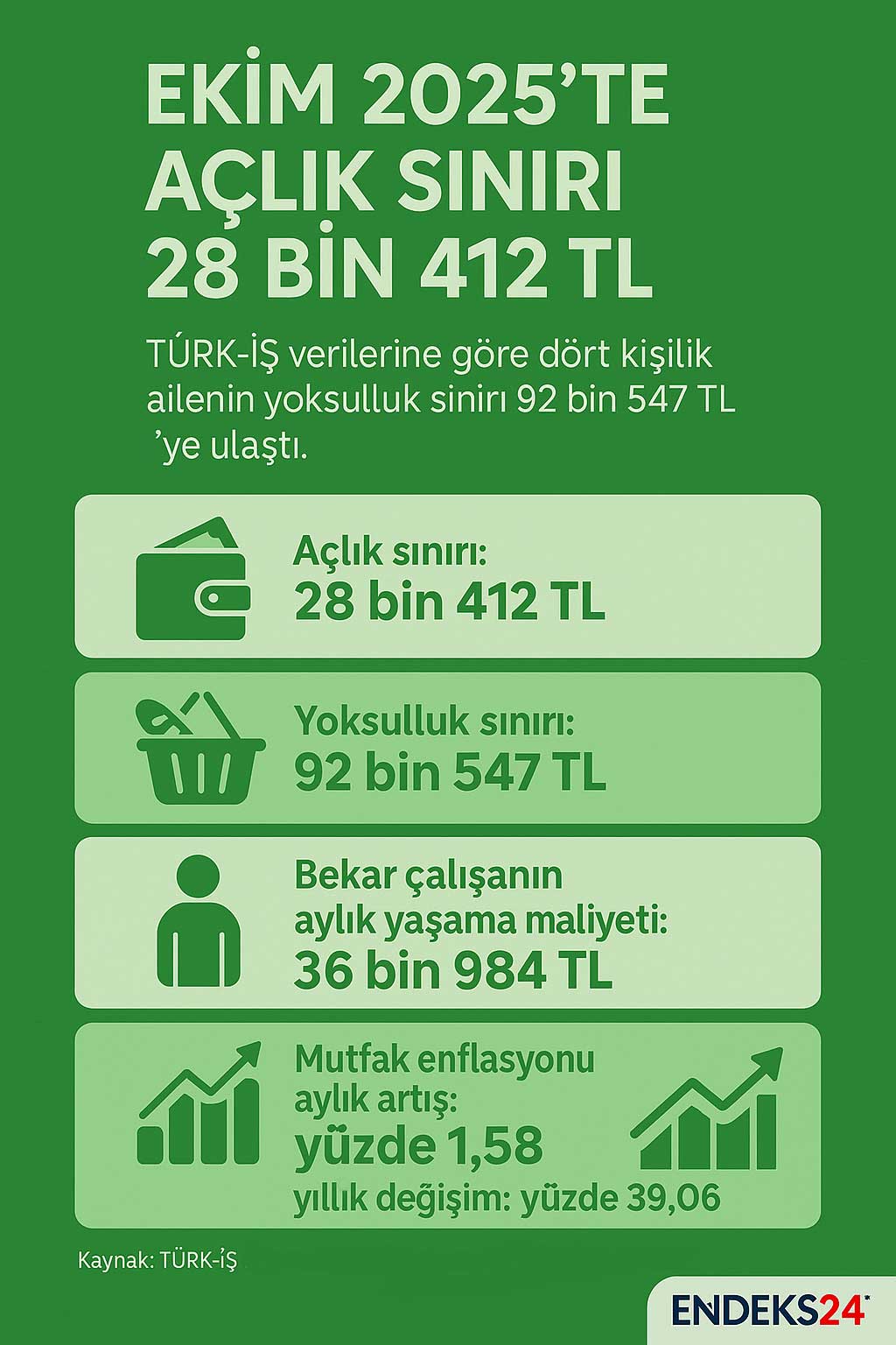 Türkiye İşçi Sendikaları Konfederasyonu (TÜRK İŞ), Ekim 2025’e ilişkin açlık ve yoksulluk sınırı araştırmasının sonuçlarını açıkladı. Araştırmaya göre, dört kişilik bir ailenin sağlıklı, dengeli ve yeterli beslenebilmesi için yapması gereken aylık gıda harcaması 28 bin 412 lira olarak hesaplandı. Aynı dönemde yoksulluk sınırı ise 92 bin 547 liraya ulaştı.