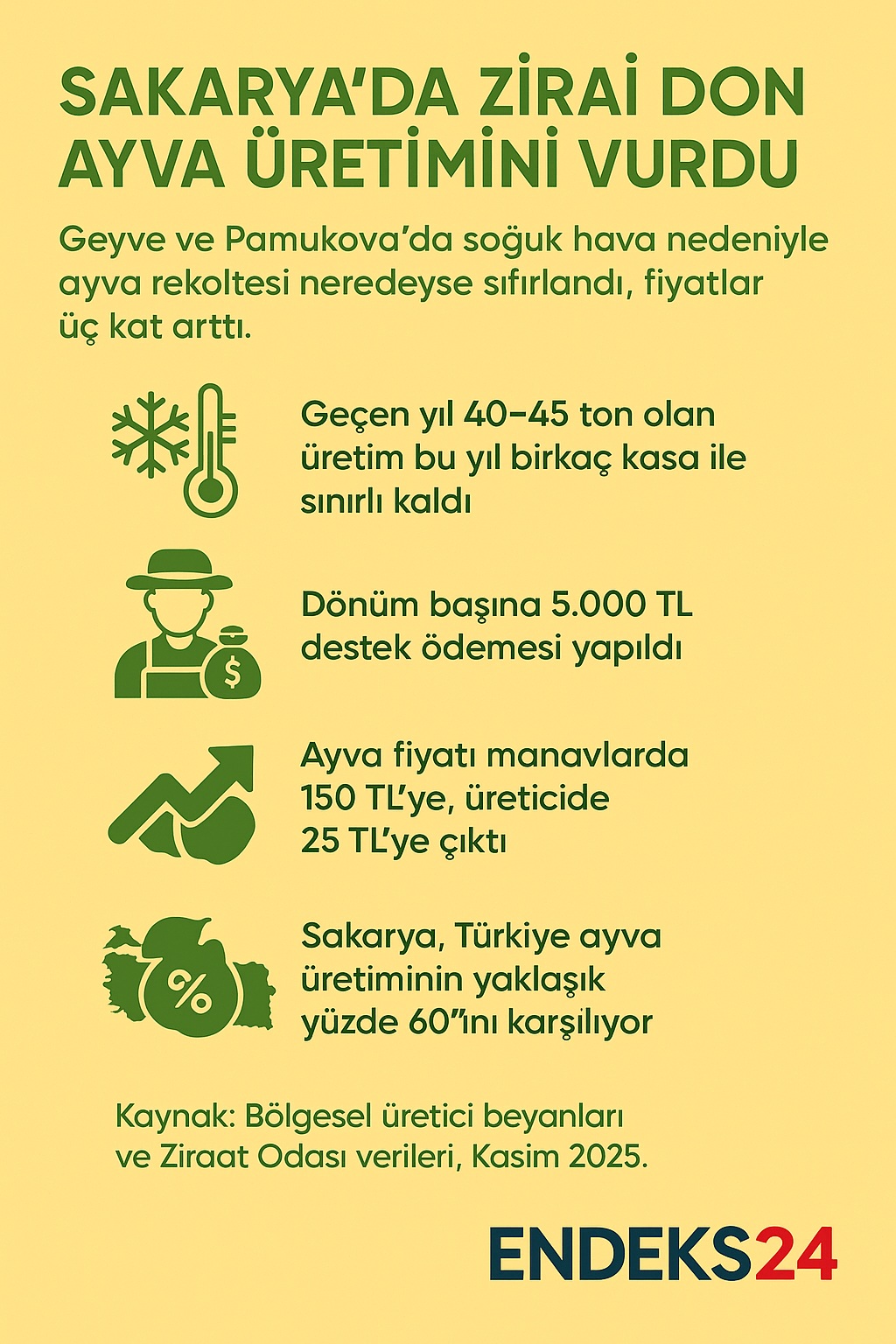Sakarya, Türkiye’nin ayva üretiminin yaklaşık yüzde 60’ını karşılıyor. Geyve ve Pamukova ovalarındaki üretim kaybı, ülke genelindeki arzı da daralttı. Tarım uzmanları, iklim değişikliğine bağlı ani sıcaklık düşüşlerinin meyve üretimini olumsuz etkilediğini ve benzer risklerin ilerleyen dönemlerde de devam edebileceğini belirtiyor.